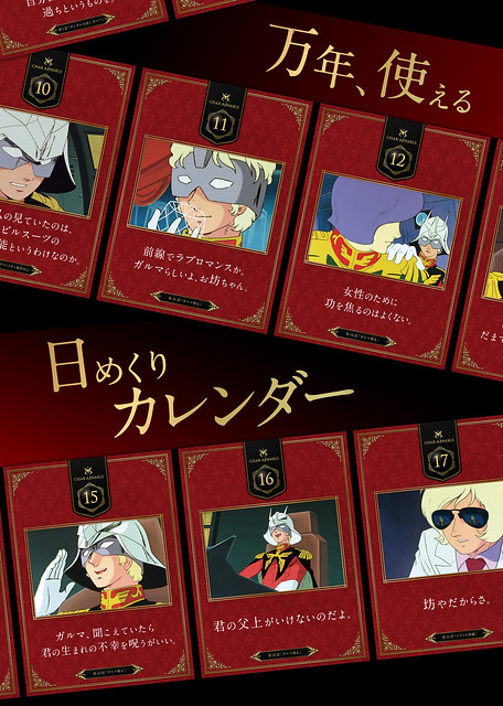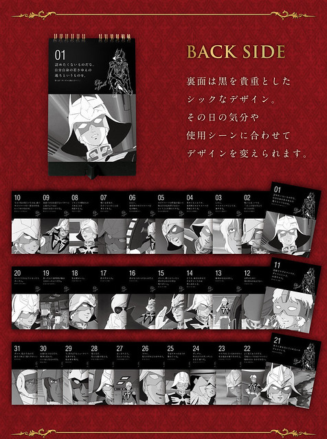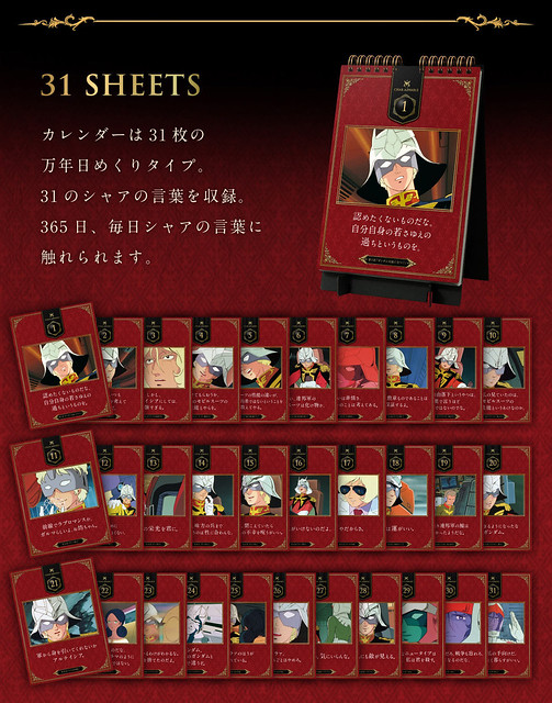 知名日廠Bandai萬代玩具公司這次將以《機動戰士鋼彈》動畫為題材,來推出特別的「夏亞名言錄 萬年曆(日めくり万年カレンダー シャアの言葉)」(名稱暫譯),收錄有約夏亞在劇中31個令人印象深刻的場景和對話,運用象徵夏亞專用機體的"紅色”來設計,背面以灰階別緻設計來組成,或是根據當天的情緒來使用,擺放在桌上可以讓夏亞每天都激勵你上班或是上課,喜愛《機動戰士鋼彈》動畫系列作品的玩具人可以參考一下歐!