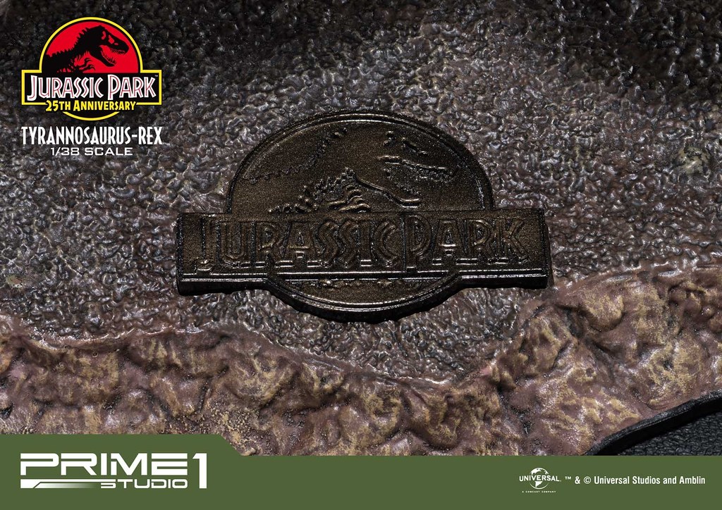 這次的新產品線是以更加精巧的比例製作,在價格與空間擺放上都更為親民,本作高約18.2 公分,長度則是24.9 公分,雖然尺寸變小,但保留了過去大比例作品的製作水平,佈滿皺紋的粗糙皮膚、各部位的紋路與光澤、軀體的肌肉線條都細膩形塑,頭部的細小顆粒、牙齒的污垢,以及漸層上色都讓霸王龍極具生物感!在欣賞完兇暴、逼真的臉之後,兩隻小到不行的手手有著超反差的療癒感,地台也做出了經典的《侏羅紀公園》標誌!