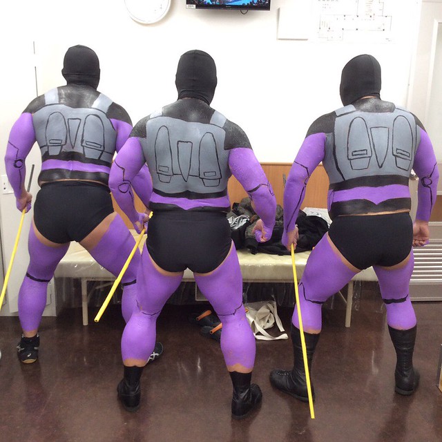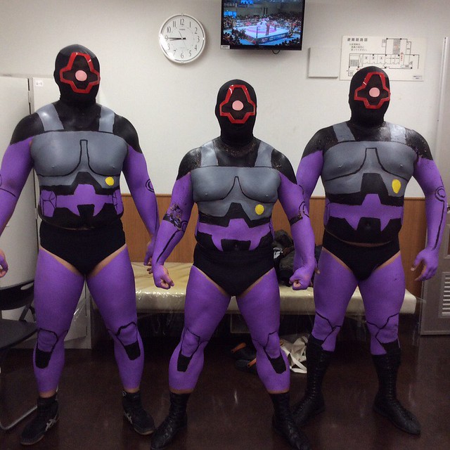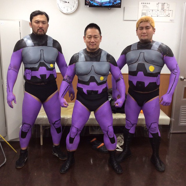 今年的「跨年摔角2018」來到第6試合時,大社長「高木三四郎」、「宇藤純久」、「鈴木秀樹」的登場引起驚呼,三人皆以人體彩繪方式裝扮成《機動戰士鋼彈》中的機體「MS-09 德姆」,甚至還帶著熱能軍刀、巨型火箭炮(的道具)上場對戰「超級鬥魂三銃士(スーパー闘魂三銃士)」,並且重現黑色三連星知名的「噴射氣流攻擊」啊!精彩的表演讓會場、TWITTER 上的觀眾都大為興奮!
