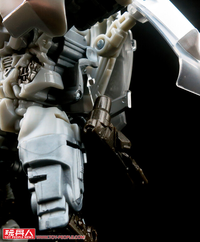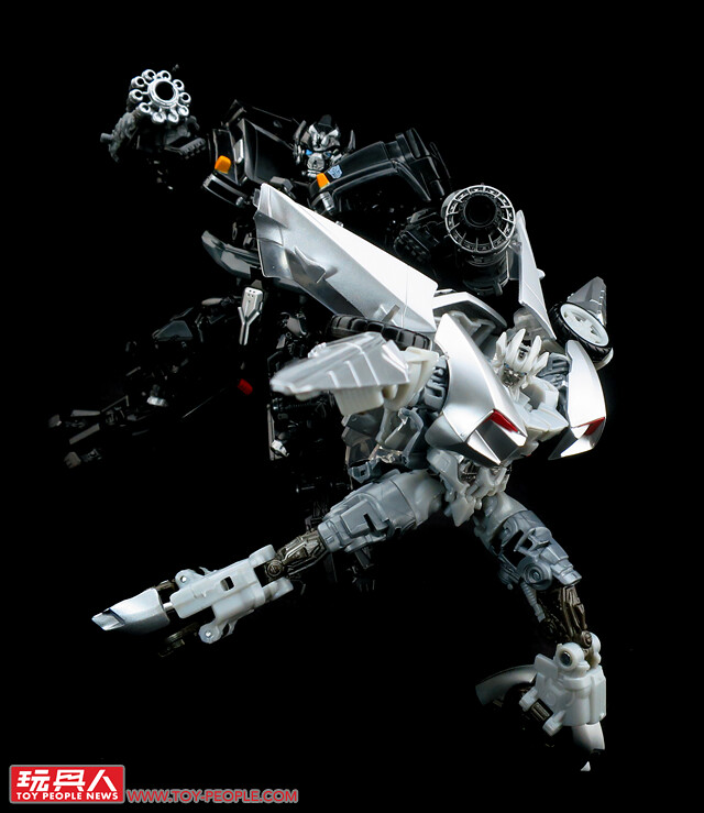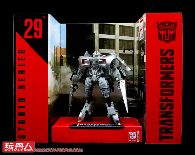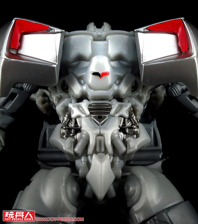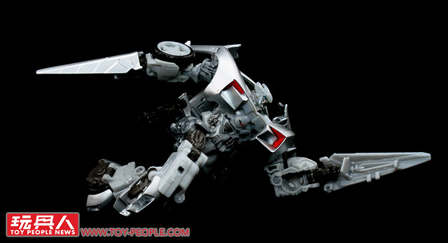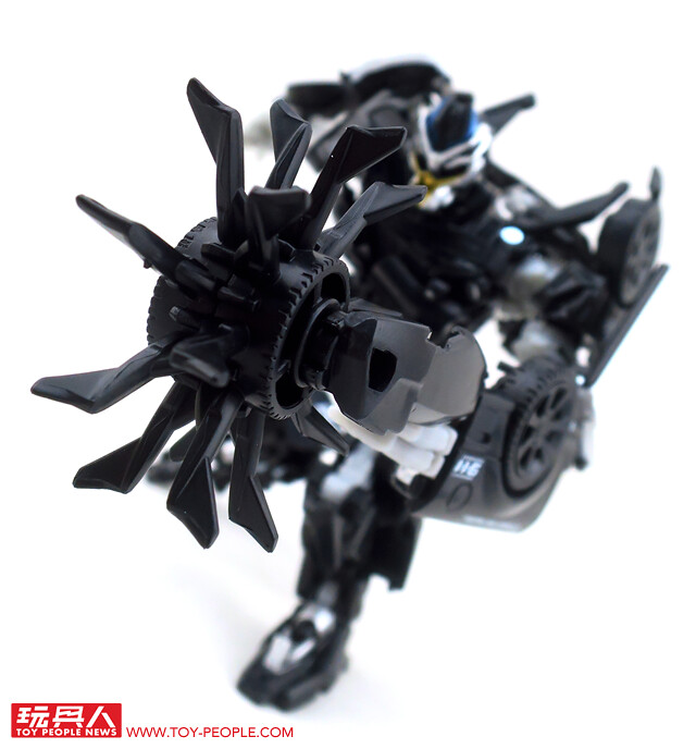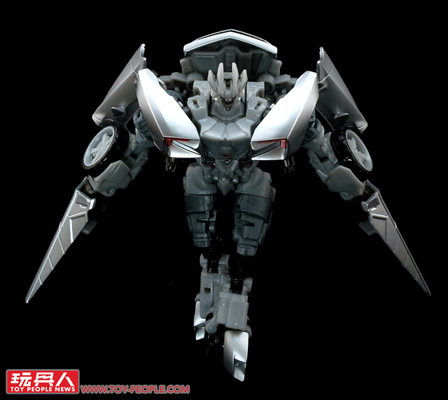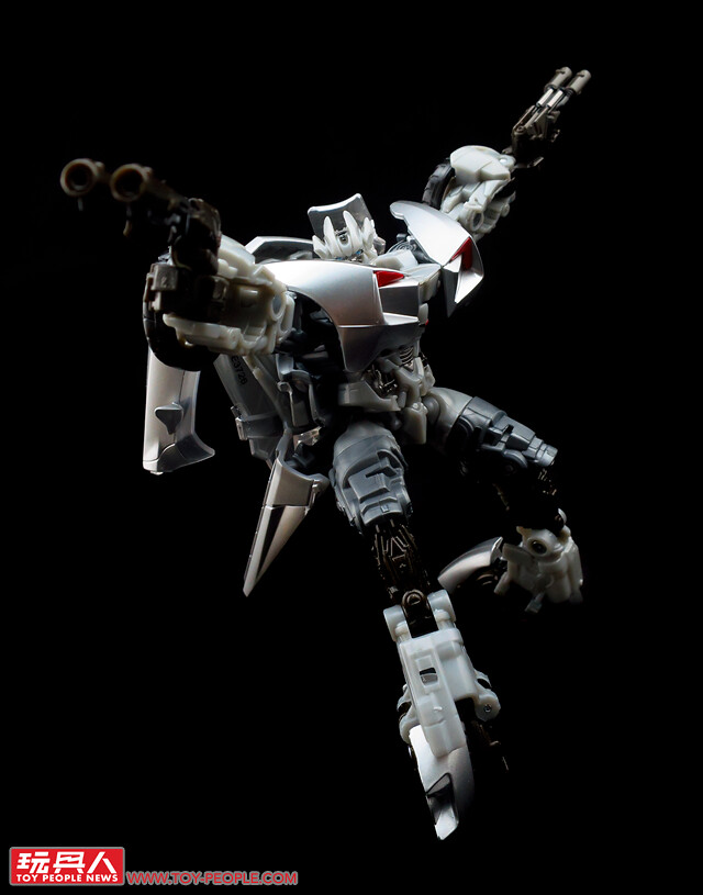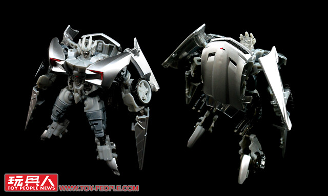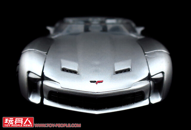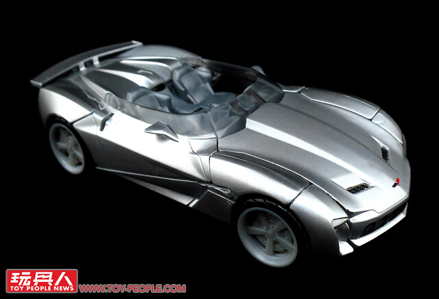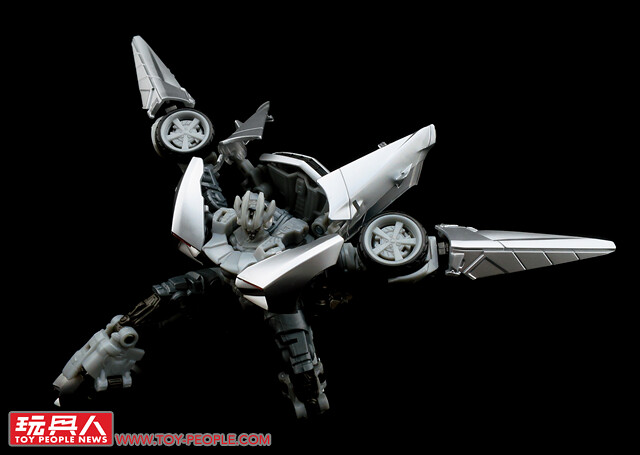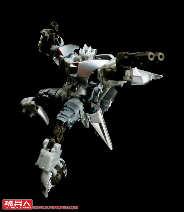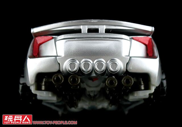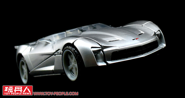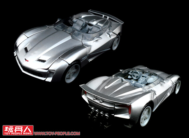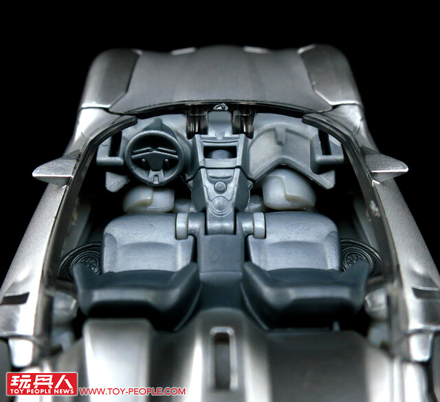 ▼載具模式採用了第三集的敞篷車版本,車殼的銀色烤漆相當地亮眼,雙刀雙槍也與車形融為一體,可說是體現了「Robots in disguise」的極佳典範。