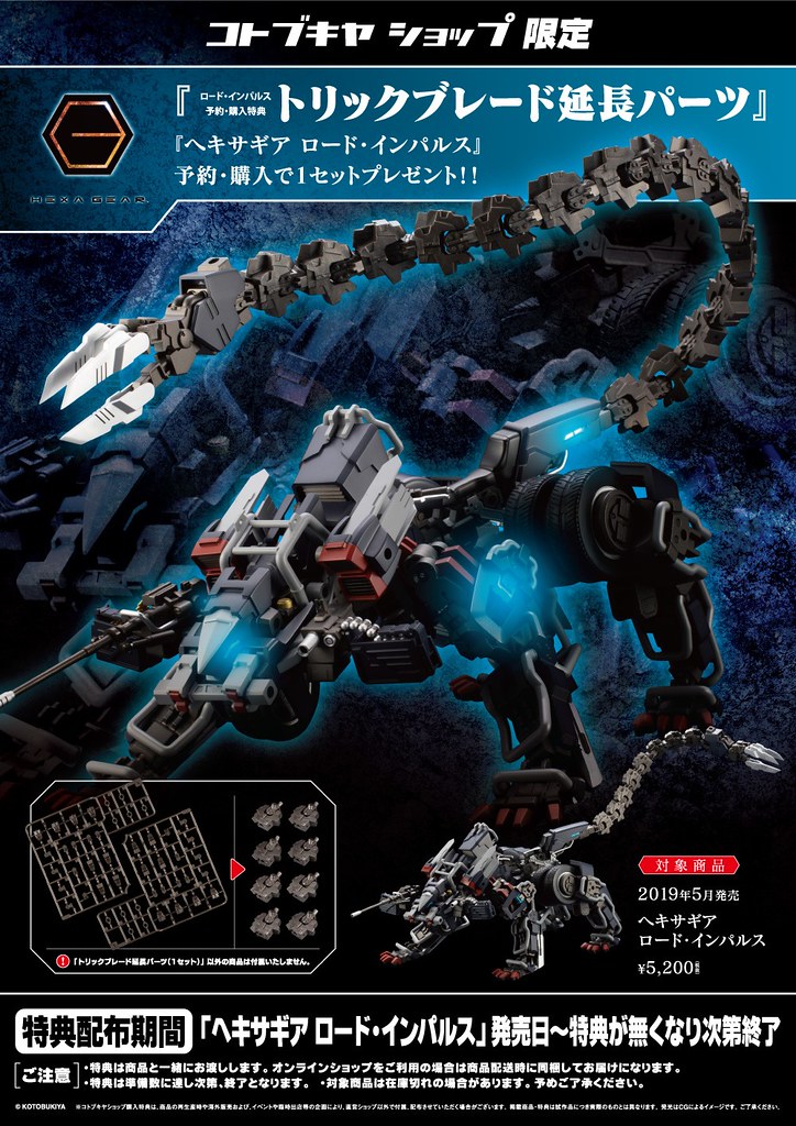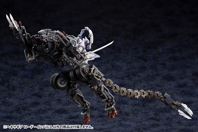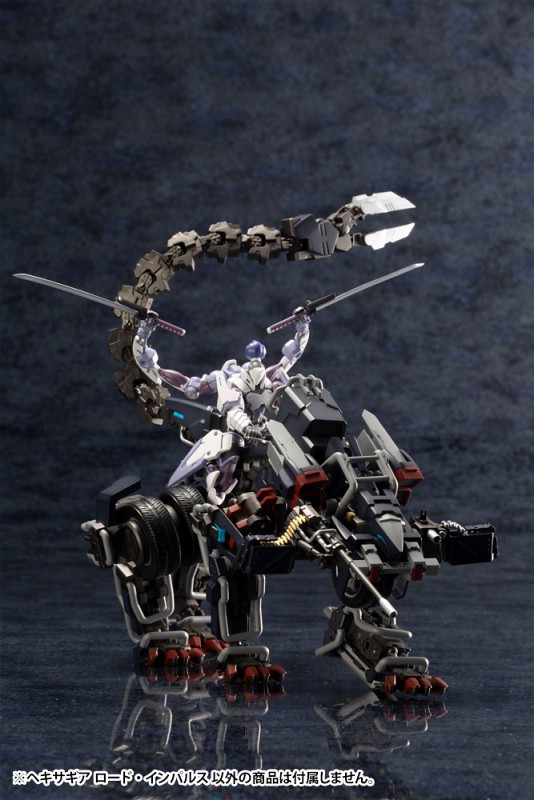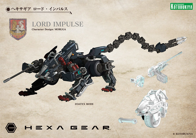 「HEXA GEAR Lord Impulse」套件能從格鬥形態「獸化模式」轉換為移動形態「載具模式」,腰部與後腿關節採用新規零件製作,比起前作「RAYBLADE IMPULSE」的可動性更為上升。特徵的尾部「TRICK BLADE」各節都由 3mm 孔軸組成,不僅能夠上下左右自由擺動,使用複數零件還能無限延伸!