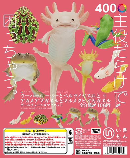 日廠"株式会社いきもん"推出相當熱賣的「自然色彩(NATURE TECHNI COLOUR)」轉蛋系列,這次的「墨西哥鈍口螈&鐘角蛙&紅眼樹蛙&圓眼珍珠蛙(ウーパールーパーとベルツノガエルとアカメアマガエルとマルメタピオカガエル)」的"吊飾&磁鐵(ボールチェーン&マグネット)"的轉蛋作品將於今年2月再次販售,之前錯過這款話題性十足的兩棲動物轉蛋作品的玩具人,別錯過此次的再次販售了歐!