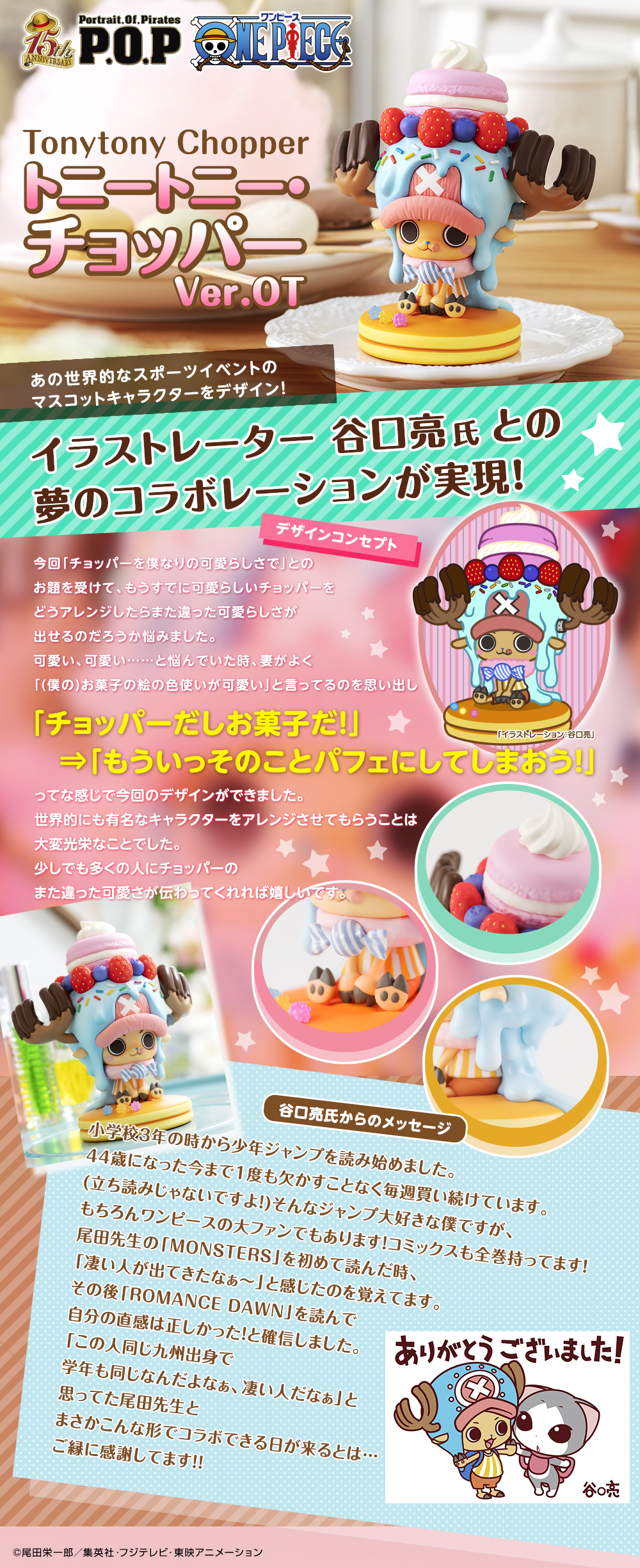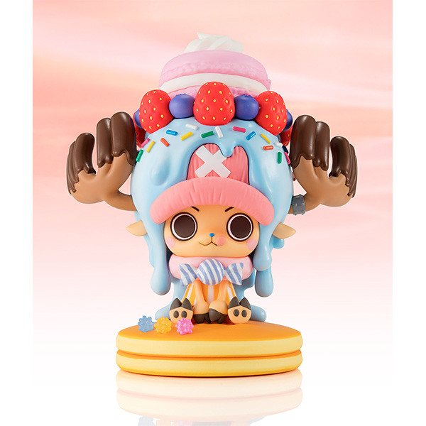 這次是以15週年紀念來推出全新規造型,交由東京奧運會吉祥物設計師「谷口亮」所繪製的造型模樣來呈現,谷口亮運用最喜愛的"甜食"來加上此次喬巴造型,可以看見底座就是坐在鬆餅上面,角還淋上了巧克力醬、頭上也有草莓、藍莓等等蛋糕裝飾,此作將於Premium Bandai、MEGATREASHOP、東映動畫ONLINE SHOP、JUMP ONLINE STORE、日本ONE PIECE專門店等等指定通路線限定販售,喜愛《航海王》系列作品的玩具人可以參考一下歐!