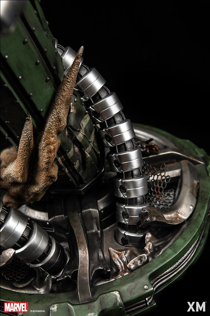 這次的作品呈現出蜘蛛人超動感的飛躍姿態,同時在場景裡注入蜘蛛人故事中經典反派的標誌性元素!蜘蛛人右手抓著蜘蛛絲、左手則向後延展,加上彎曲的雙腿極具張力!招牌的紅、藍戰衣細膩刻畫出猶如蜘蛛網狀的格紋、胸前的蜘蛛標誌,並生動地形塑肌肉形狀,精湛的塗裝技巧則使其線條更為立體,蜘蛛人還包含了麥法蘭(McFarlane)的大眼版、羅米塔(Romita)版本,以及戰損版的彼得·帕克三種頭雕。