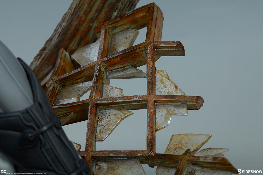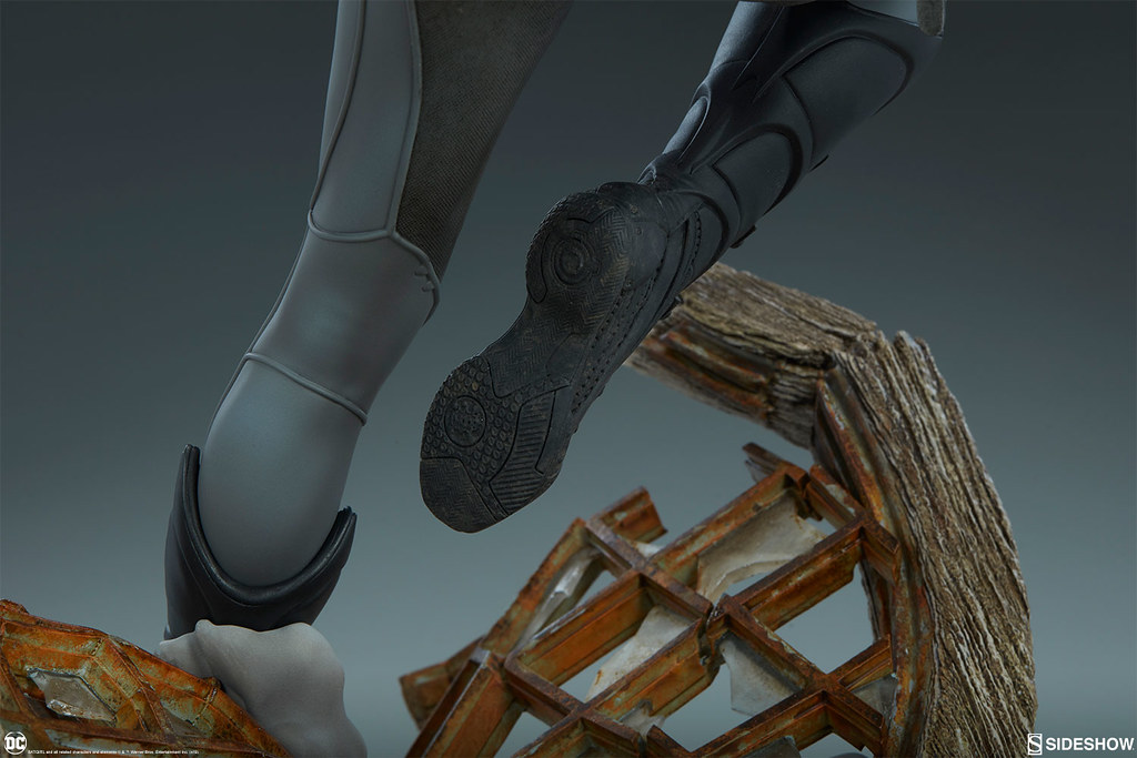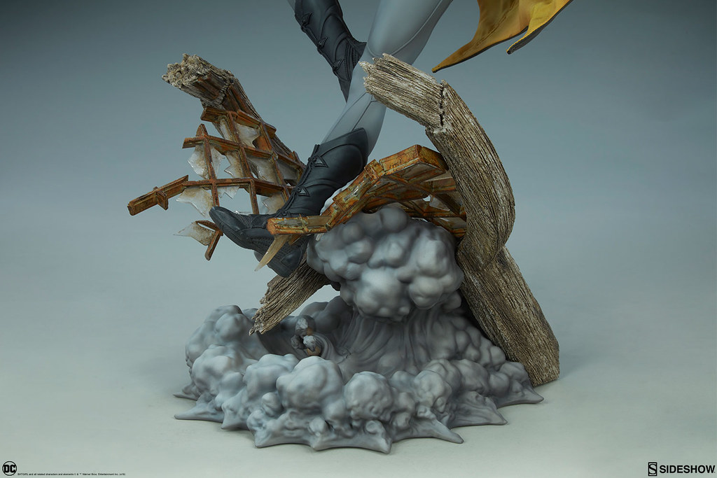「Premium Format Figure 蝙蝠女」高約53.3 公分,呈現出芭芭拉從天而降、正要穿過破碎天花板的躍動姿態,向後延展撐開披風的雙手、一彎一直的雙腳、飛舞的長髮,整體動作的表現相當逼真精彩!連腰帶的口袋都營造出因向下墜落而飄揚的動感,灰色貼身戰衣、手套、長靴,置於右大腿槍套的鉤爪槍皆施以細膩刻畫,內置鐵絲的布料披風能自由調整狀態,毀壞的天花板地台完全能感受到其老舊的質地,仔細看還能發現到小小的煙霧彈!