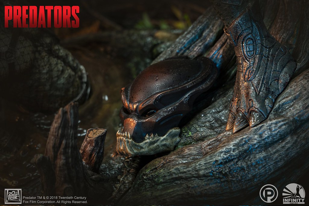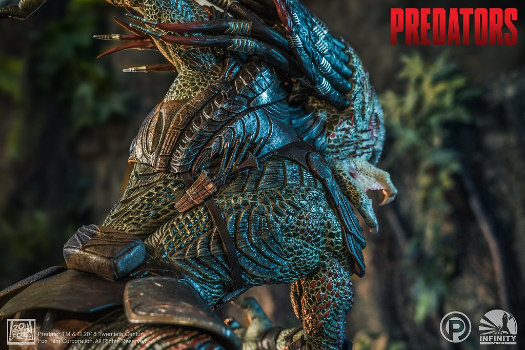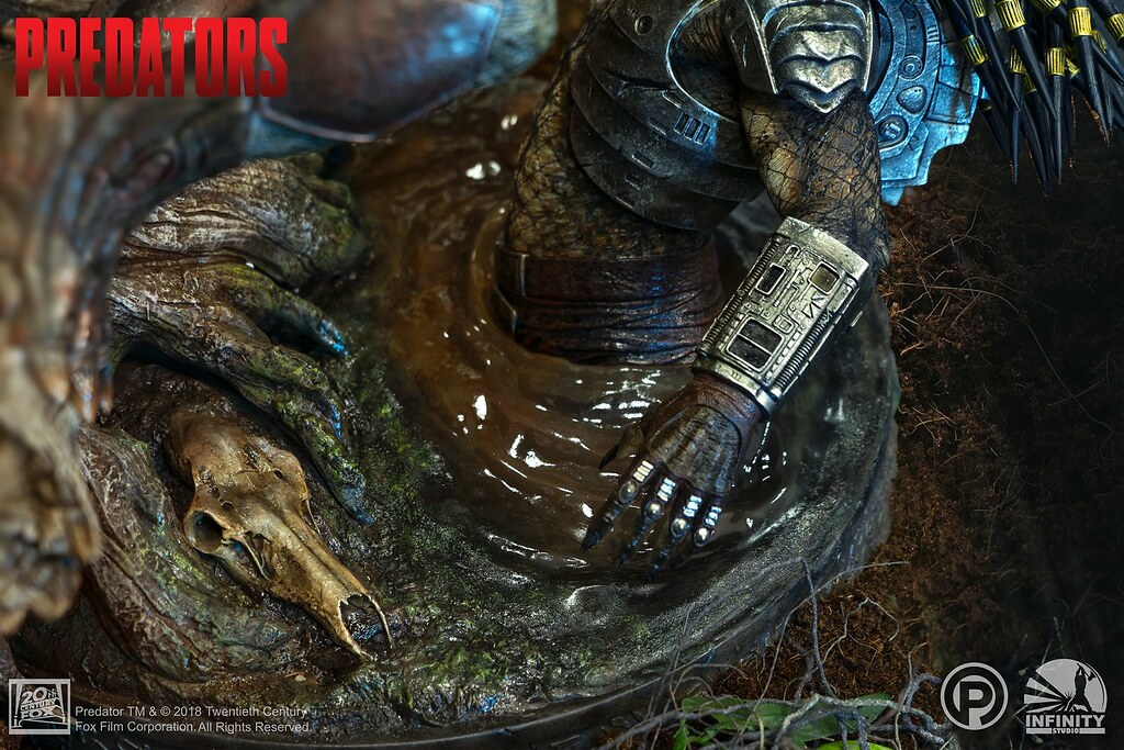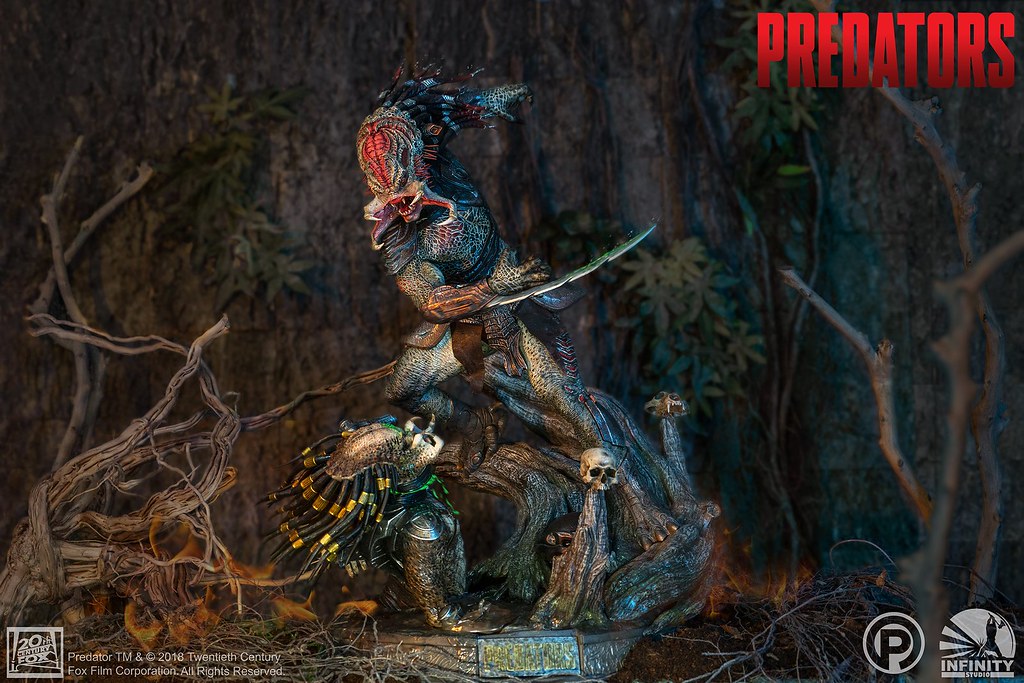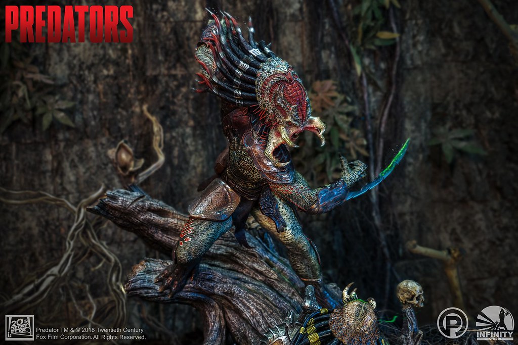 「狂戰士終極戰士 全身場景雕像」高約72 公分,以超高水準的製作技術再現了狂戰士終極戰士的躍動造型,扭身姿態加上飛舞的頭髮,以及露出半身、被手刃的終極戰士,整體極具速度感,兩位終戰的粗糙皮膚、佈滿全身的斑點、恐怖的嘴型......等細節都形塑出極為逼真的生物感,盔甲施以厚重的塗裝與戰損處理,環境的刻畫也十分精美,樹木擁有寫實質地,還能看到狂戰士終極戰士隨手一丟的面具,底座鑲著的「PREDATORS」名牌更添收藏價值,真的超讚~