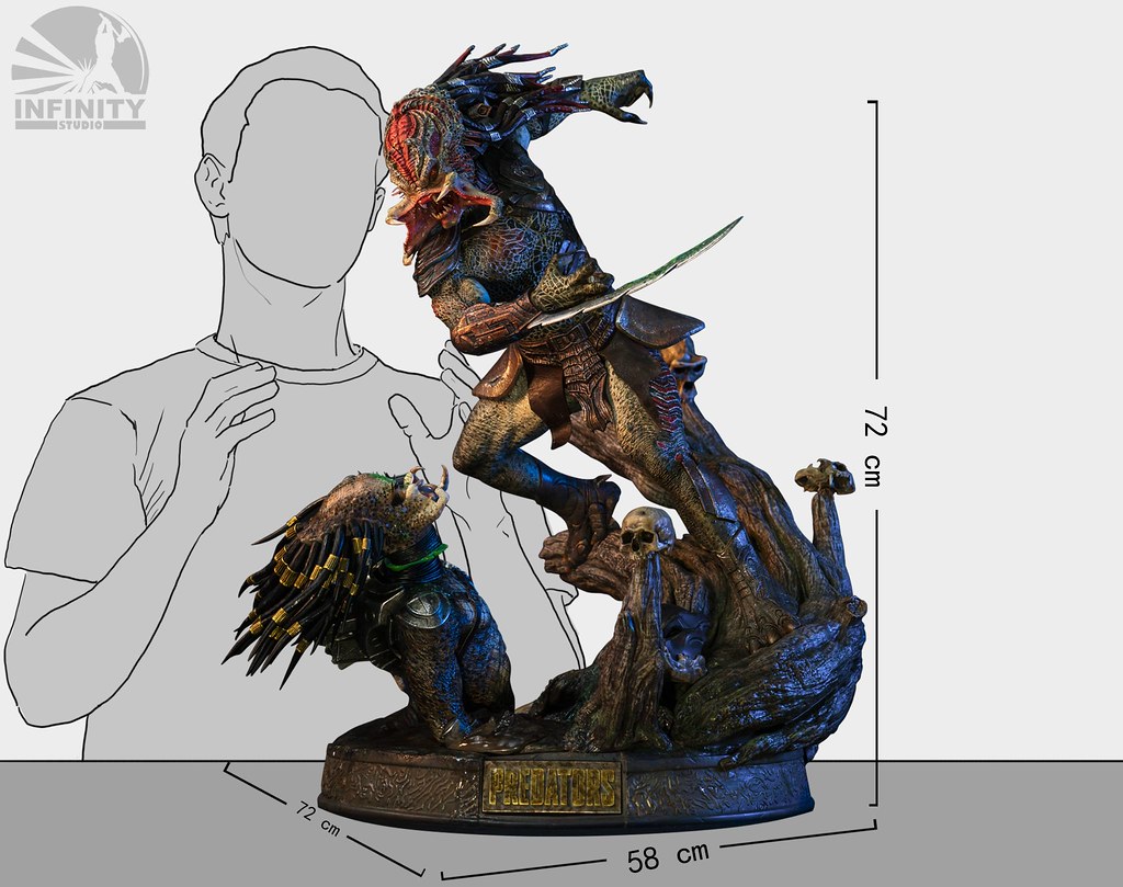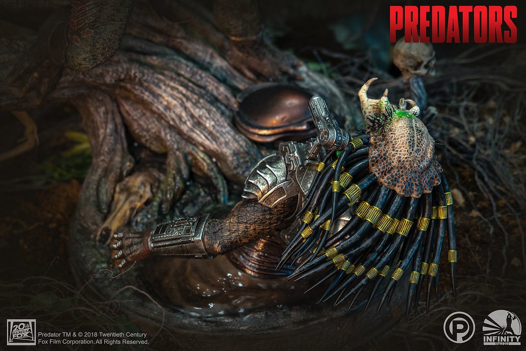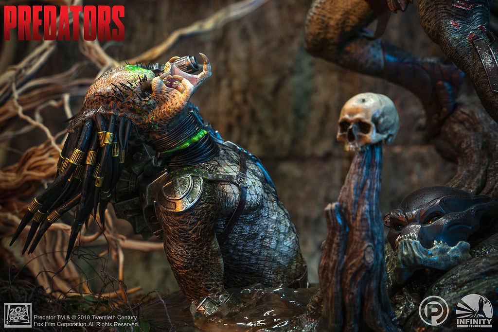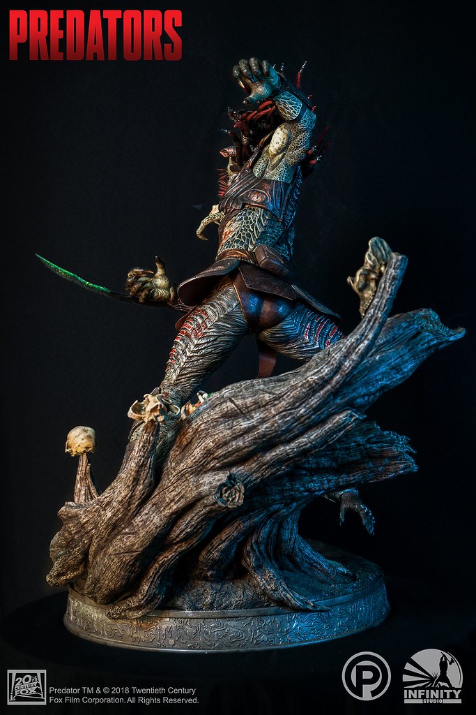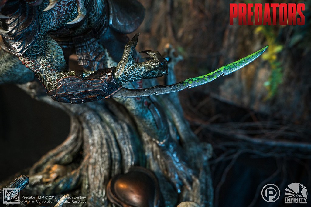 「狂戰士終極戰士 全身場景雕像」高約72 公分,以超高水準的製作技術再現了狂戰士終極戰士的躍動造型,扭身姿態加上飛舞的頭髮,以及露出半身、被手刃的終極戰士,整體極具速度感,兩位終戰的粗糙皮膚、佈滿全身的斑點、恐怖的嘴型......等細節都形塑出極為逼真的生物感,盔甲施以厚重的塗裝與戰損處理,環境的刻畫也十分精美,樹木擁有寫實質地,還能看到狂戰士終極戰士隨手一丟的面具,底座鑲著的「PREDATORS」名牌更添收藏價值,真的超讚~
