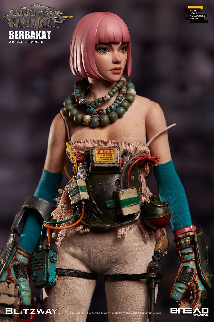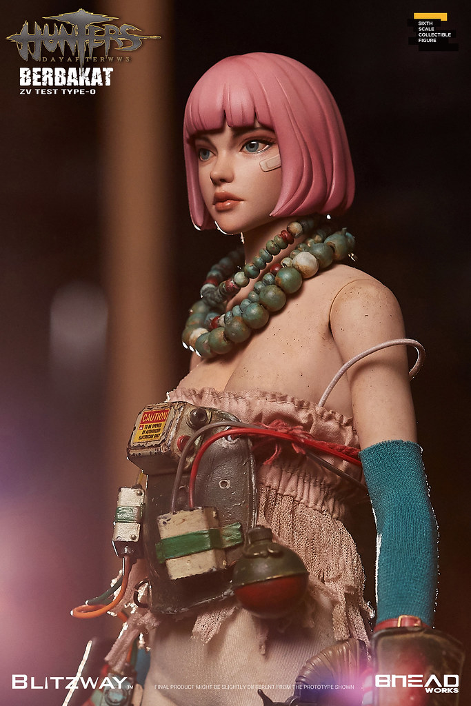 「BERBAKAT ZV Test Type-0」高約29 公分,全新開發的女性素體擁有20處可動,頂著粉紅色短髮,雙眼的妝容細緻描繪,身穿淡粉色的貼身背心、米黃色的Legging 與高跟鞋,雙手還戴著藍綠色護腕,脖子上的項鍊、手套、身上掛載的裝備與大型的自製步槍......,不論是色彩運用或是其獨特設計都讓人印象深刻!還可以戴上揉合了科技感、廢土風的全罩式頭盔,展現出各種帥氣的樣貌!