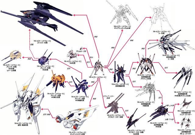 而鋼彈TR-6 [海茲爾II]便是其中種換裝型態,本體主要由伍德沃特構成,並將腰部推進器換裝為[海瑟斯雷II]的 MEGA 粒子砲型,左腕裝備[基哈爾II]的強化零件,背部搭載兩基巨大的「複合盾推進器」,除了用以加速外還能作為兩門高出力光束加農砲使用。鋼彈TR-6 [海茲爾II]也具備變形為 MA 的機能,但無法單機突入大氣層。