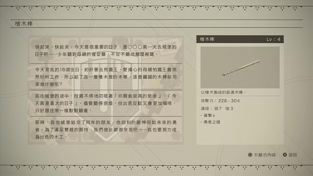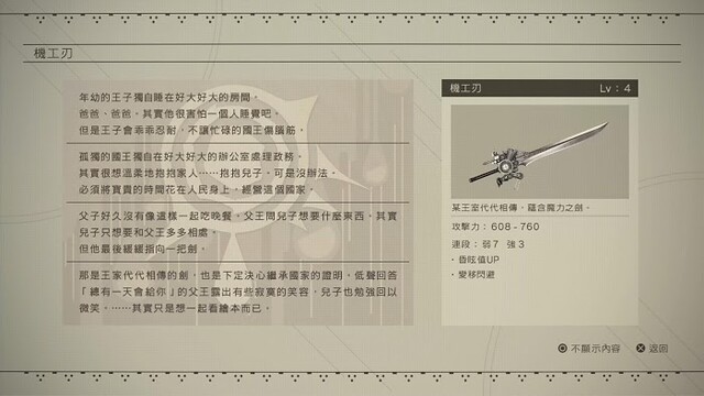 除了華麗爽快的戰鬥系統、耐人尋味的劇情外,收集藏於地圖各處的武器也是《尼爾:自動人形》的趣味之一。每把武器不僅外型各具特色,還擁有各自的故事背景,在遊戲中打開 DATA 就能查看這些精彩的故事,了解每把的武器的來歷與前使用者的遭遇或個性,其中與《勇者鬥惡龍》連動的「檜木棒」、與《FF15》連動的「機工刃」也都描寫了原作的故事,相當有趣!