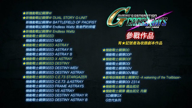 而玩家最在意的所有參戰作品也同步公開,相對於前作《SD鋼彈 G世代 火線縱橫》完全收錄宇宙世紀作品,這次的《SD鋼彈 G世代 火線縱橫》也極端地只收錄上述四部作品及其衍生作品,不會有宇宙世紀的作品參戰。黑歷史的元兇表示: