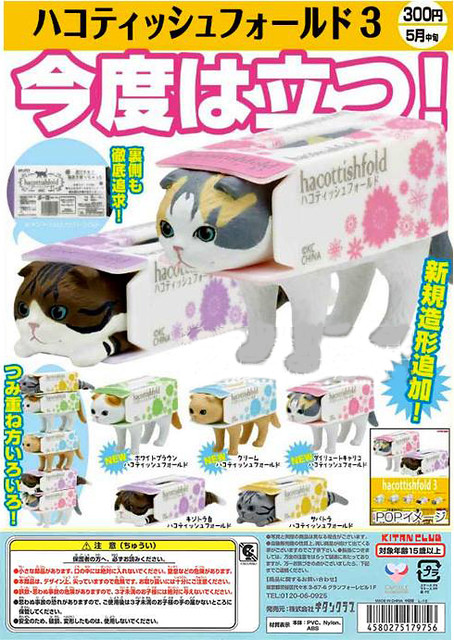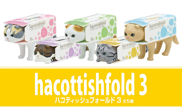 2019年4月30日新增官方宣傳圖以及販售相關資訊,將貓咪喜愛鑽入面紙盒習性,並結合了諧音命名的趣味之作,「スコティッシュ」意思是「蘇格蘭摺耳貓」(Scottish Fold),加上「面紙」(Tissue)結合成的諧音玩笑命名「スコティッシュティッシュ(Scottish Tissue)」。這次的第三彈讓貓咪的四隻腳從紙祥裡面伸出來真是太逗趣了啊!堆疊起來的模樣又有新的不同感覺,喜愛貓咪轉蛋的玩具人千萬別錯過了歐!
