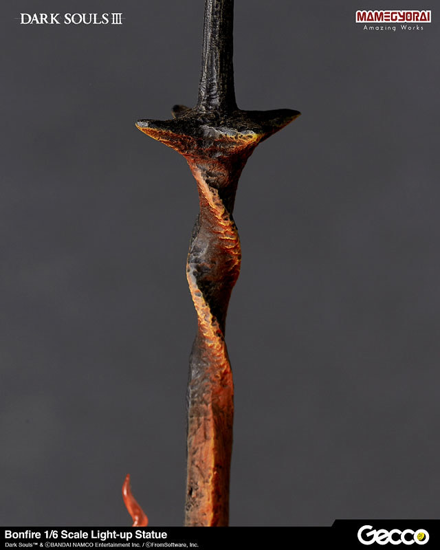 「篝火 1/6比例發光雕像」將螺旋劍的的粗糙質感和不死人遺骨、餘灰的細膩色彩忠實再現,複雜的透明火焰特效則透過數位造型製作,內藏會持續閃爍的特殊 LED 燈模組,能呈現出火光搖曳意象。整體尺寸也和過去推出的《黑暗靈魂》系列雕像相同,採用 1/6 比例製作,能夠共同擺設出洋溢世界觀魅力的場景!