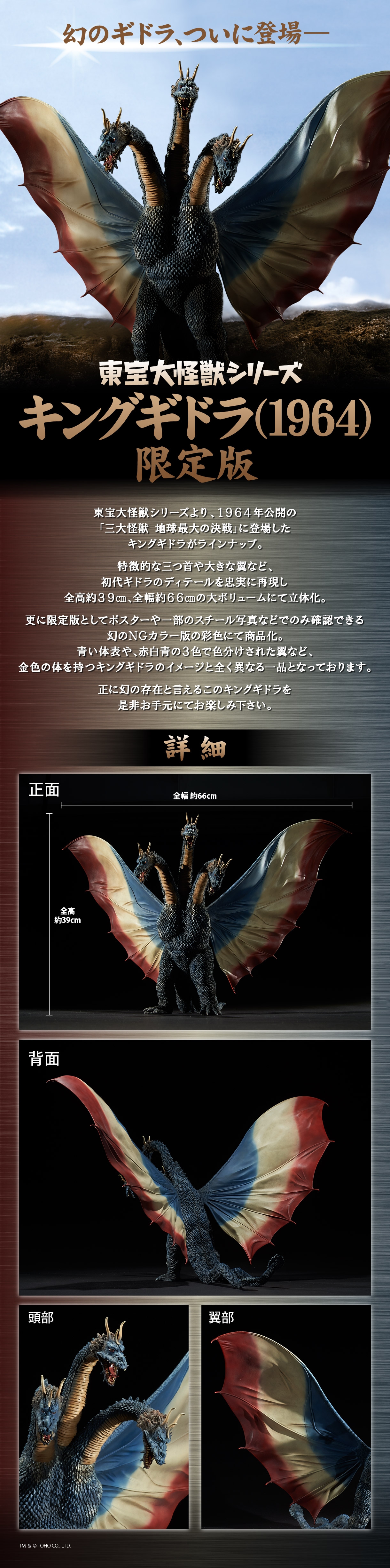 「王者基多拉(1964)限定版」擁有全高約 39 公分、全寬約 66 公分的魄力尺寸,依據電影皮套造型細膩再現初代王者基多拉的細節,而限定版更依據當年部份劇照、海報釋出的幻之「NG配色」進行塗裝,重現藍色體表、三色翅膀的特殊造型。