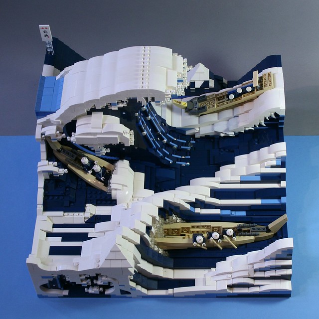 著名浮世繪巨匠葛飾北齋的《富岳三十六景》系列作品之一《神奈川沖浪裏》,是世界最知名的日本美術品之一!相信許多玩具人都有收集海洋堂推出的轉蛋作品吧~這次koffiemoc 在他flickr 頁面的作品介紹中,也提到了過去已經有樂高玩家曾經做過同主題的MOC 創作,但大多都是以2D 形式呈現,所以他決定製作一個3D 立體化版本,實....實在太壯觀啦~!