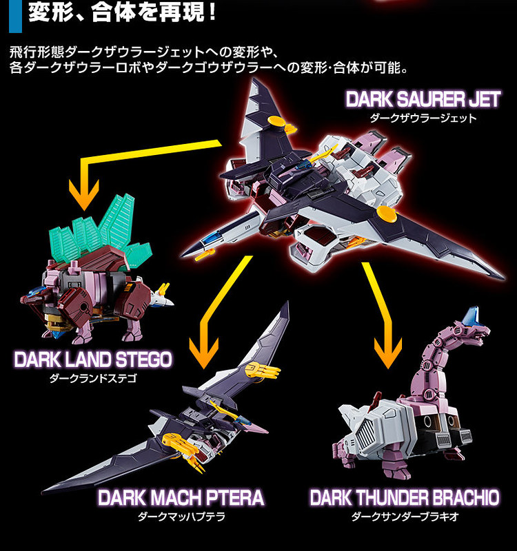 「HG 1/300 DARK GO-SAURER」除了替換整體配色、追加機械化帝國標誌貼紙外,其餘內容都和一般版相同,擁有出色的可動與變形合體機構,能再現暗黑版本的馬赫翼龍、大地劍龍、閃電雷龍,並收錄暗黑 SAURER 劍、暗黑 SAURER 盾。
