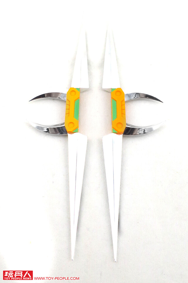 將胸口上蓋分離後從中展開的兩把雙頭刃,能夠配合靈活的身軀進行突刺、踢擊,或作為投擲武器刺向敵人。