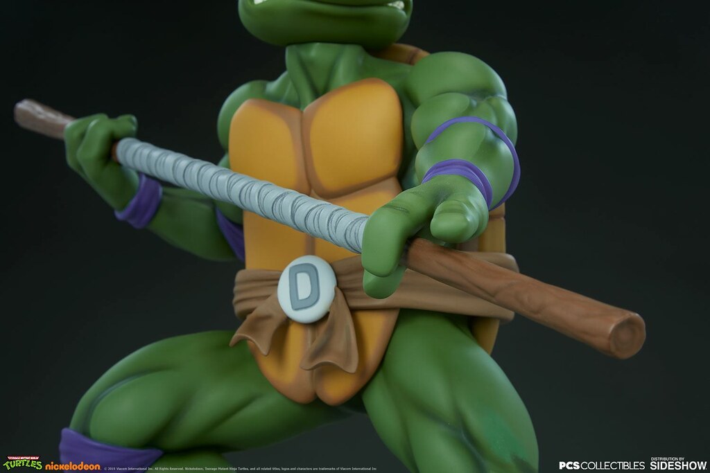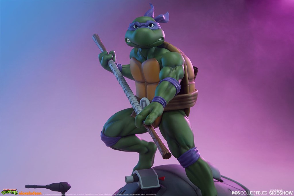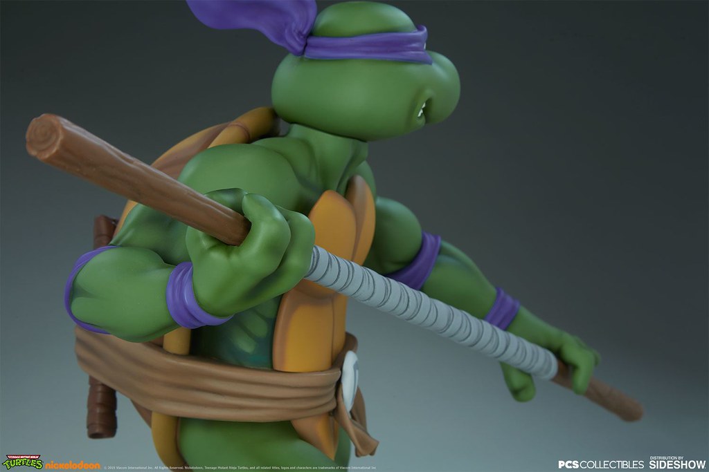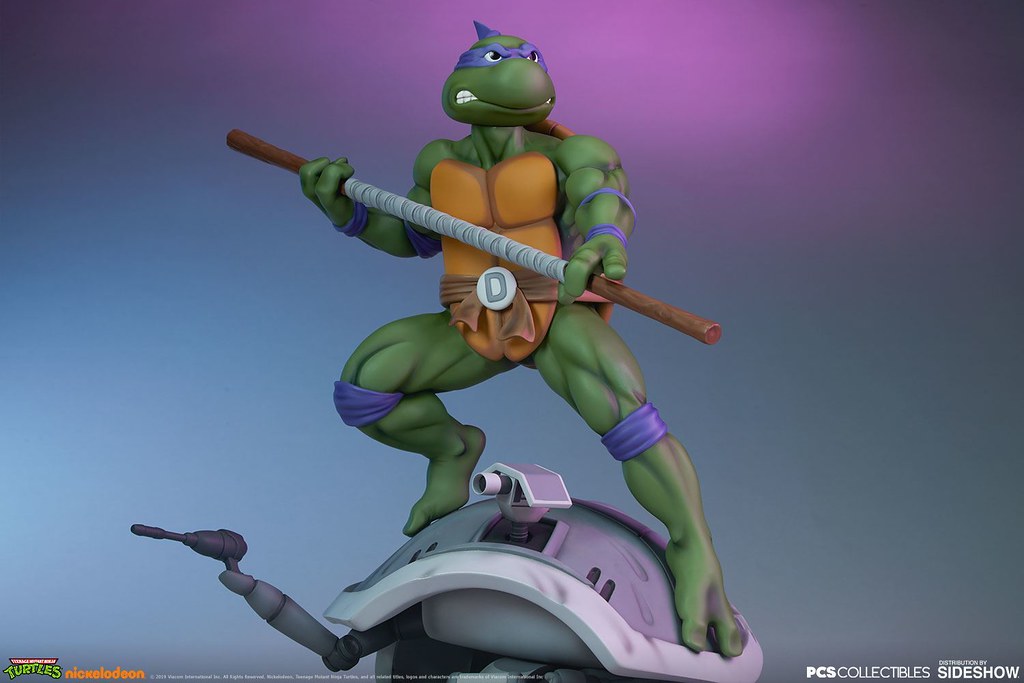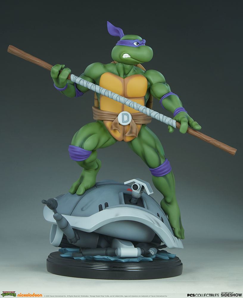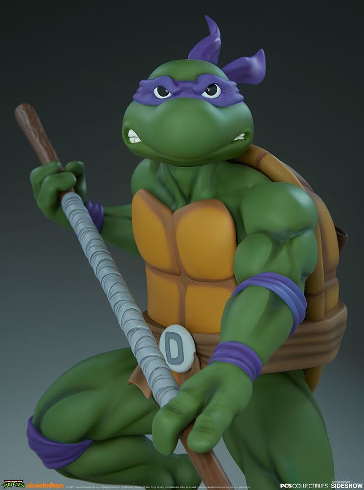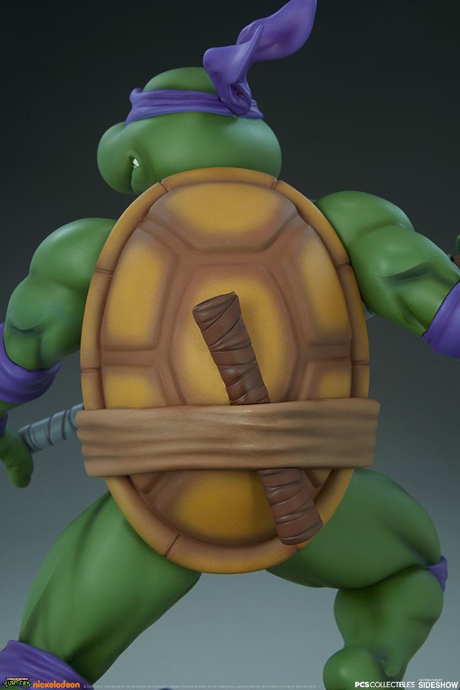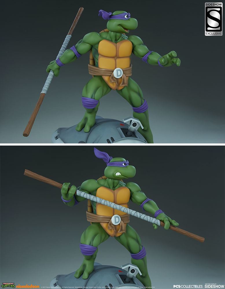 「多納太羅 1/4 比例全身雕像」高約43 公分,根據在1987年開播的動畫造型打造,再現了雙手持握棍棒、咬著牙的多納太羅,肌肉線條的形塑相當精彩,在呈現陰影效果上色的襯托下顯得更為立體,腰帶和龜殼的塗裝表現、棍棒的木紋質地、紫色面罩與綁帶的皺褶都有絕佳的表現,加上以電子圓宮(Technodrome)防禦機器人殘骸為題製作的地台,收藏價值再提升!EX版中還追加了微笑頭雕跟一對替換手喔!比上次拉斐爾差異甚小的替換零件有誠意多了呢~