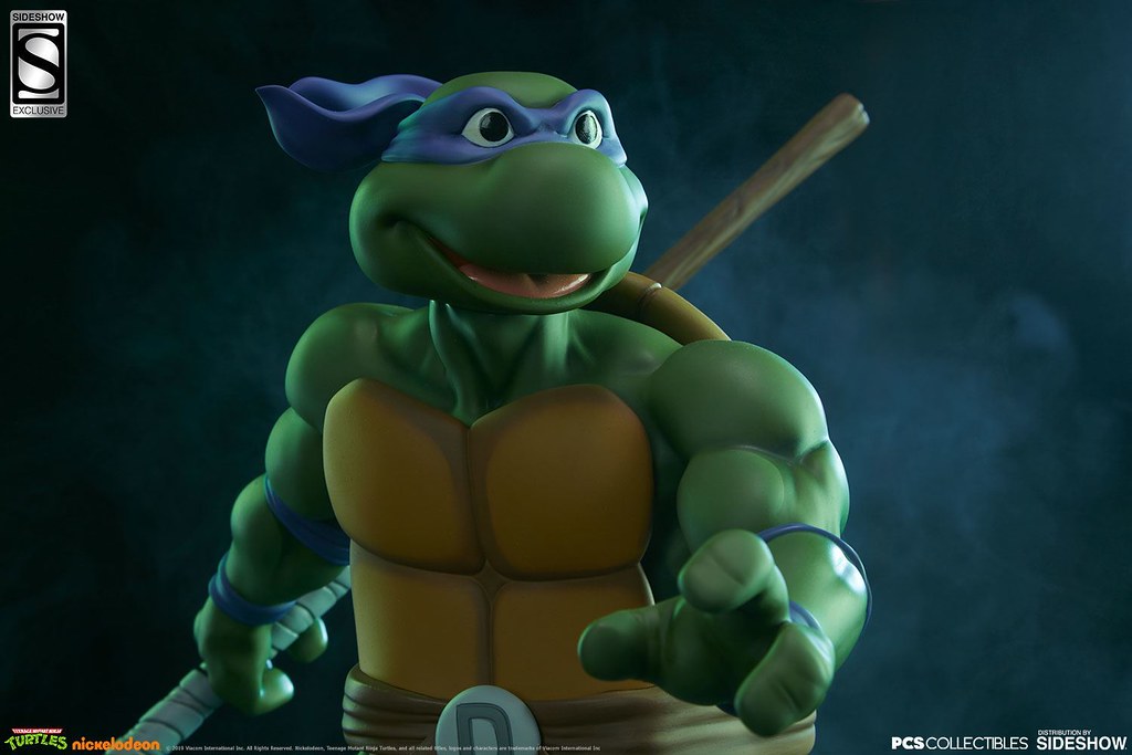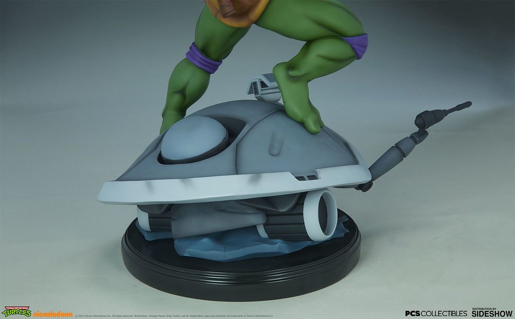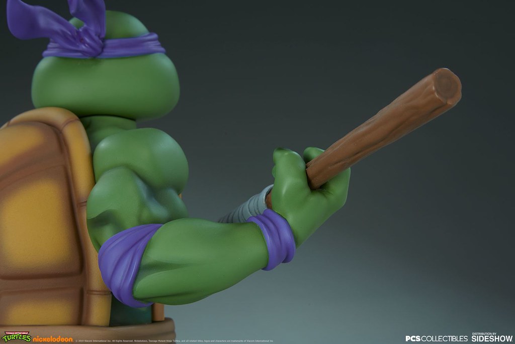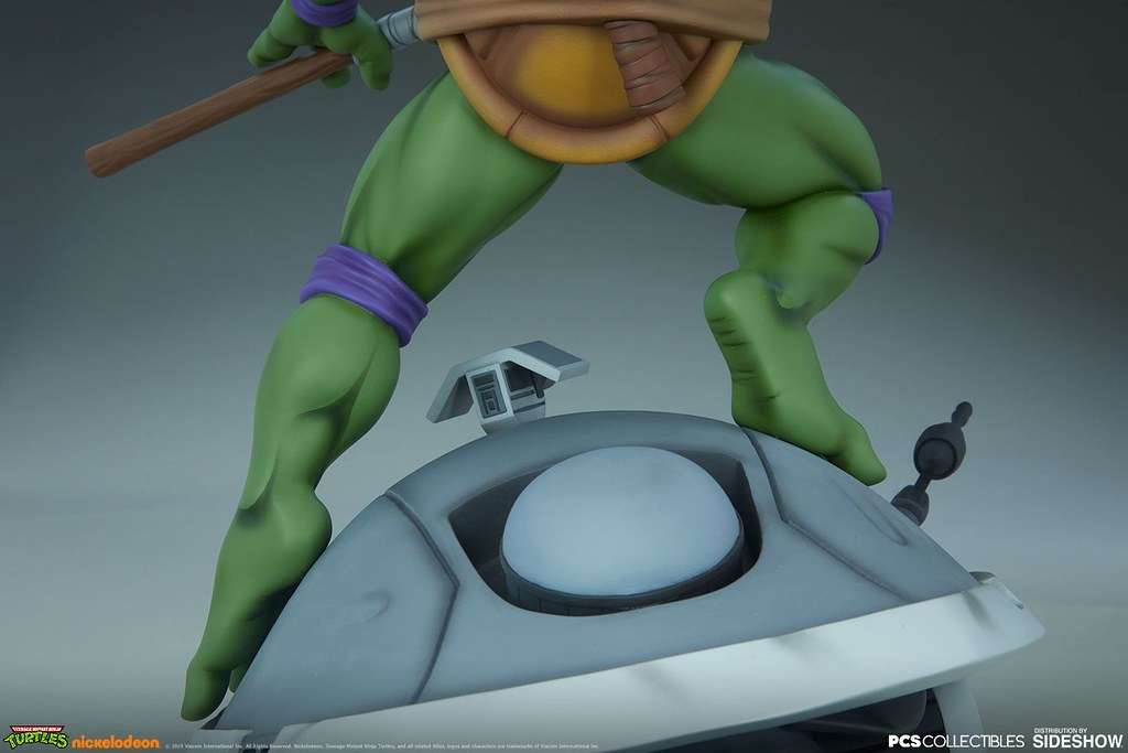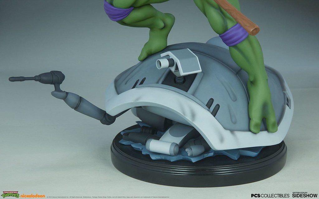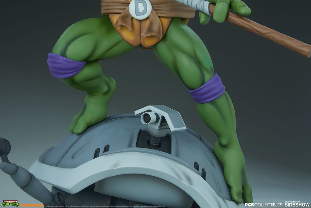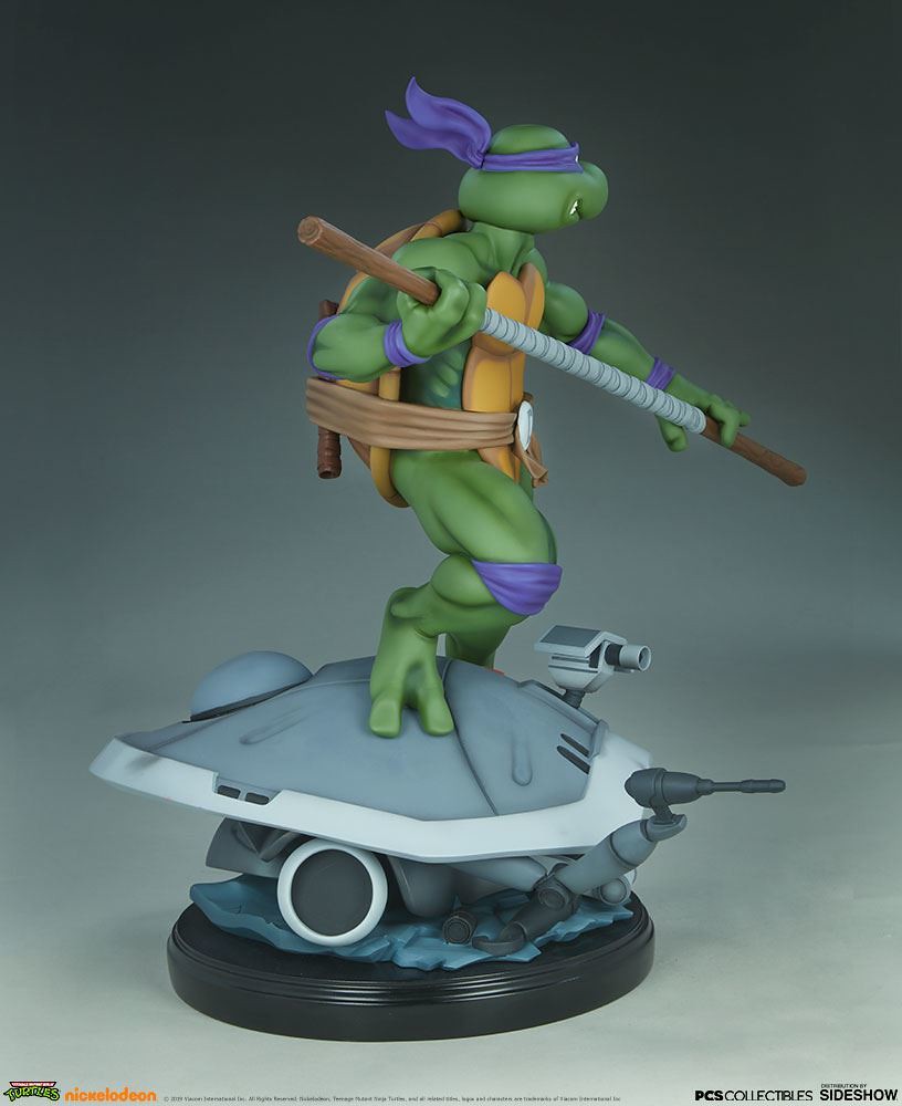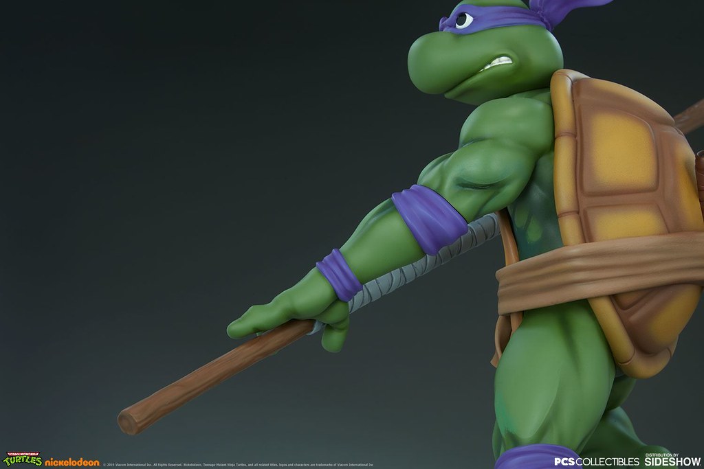 「多納太羅 1/4 比例全身雕像」高約43 公分,根據在1987年開播的動畫造型打造,再現了雙手持握棍棒、咬著牙的多納太羅,肌肉線條的形塑相當精彩,在呈現陰影效果上色的襯托下顯得更為立體,腰帶和龜殼的塗裝表現、棍棒的木紋質地、紫色面罩與綁帶的皺褶都有絕佳的表現,加上以電子圓宮(Technodrome)防禦機器人殘骸為題製作的地台,收藏價值再提升!EX版中還追加了微笑頭雕跟一對替換手喔!比上次拉斐爾差異甚小的替換零件有誠意多了呢~