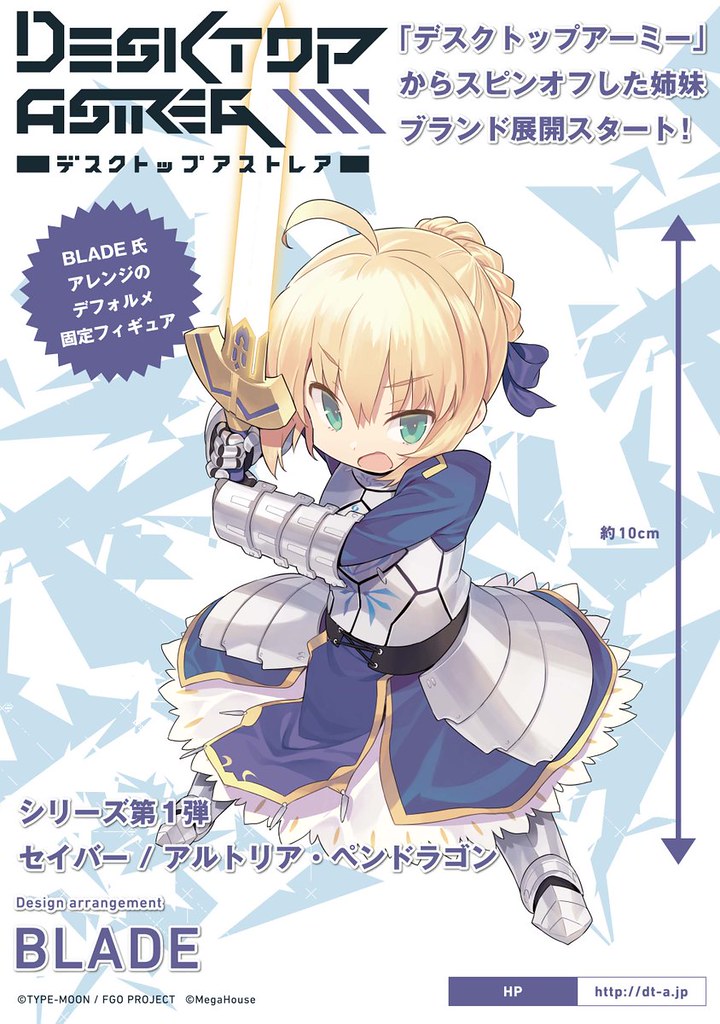 ▼ DESKTOPARMY 全新姊妹系列「DESKTOP ASTREA」發表,將繪師 BLADE 繪製的眾多角色打造成不可動模型,在全高約 10 公分的尺寸下保留可愛的身形比例,塑造出比 DESKTOPARMY 系列更精緻的細節造型。第一彈將推出大人氣 Fate 系列角色「SABER/阿爾托莉亞・潘德拉岡」。