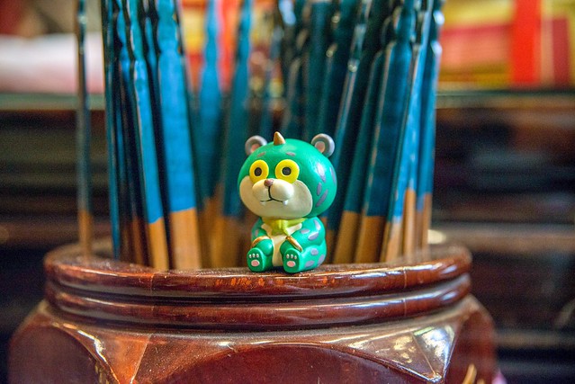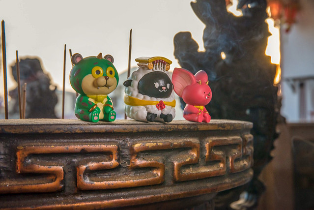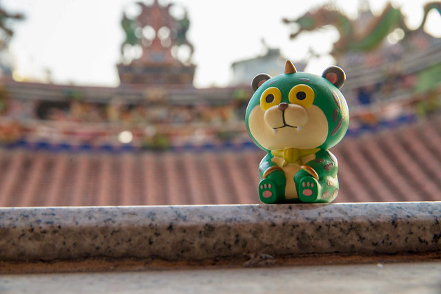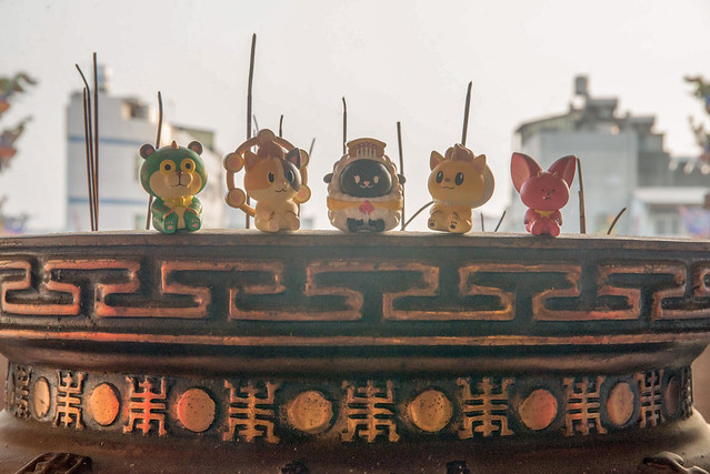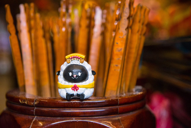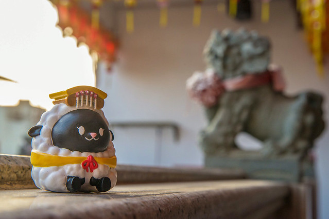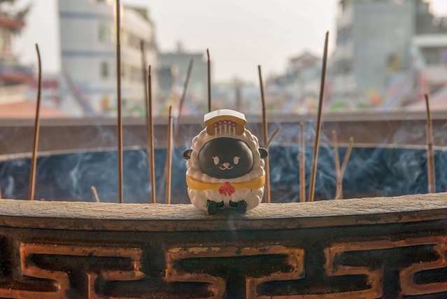 在台灣較為常見的普遍為黑臉造型的「媽祖娘娘」,有一說法是較為兇悍且執行除煞,但同時也帶給人民平靜安穩又可安撫人心的感受,所以作者選用"黑綿羊"來詮釋這尊神明。媽祖娘娘身旁的左右手「千里眼」與「順風耳」,因為千里眼是可以看見千里外的事物,所以作者選用"豹"這種動態視力極佳的動物來詮釋,順風耳其實能夠聽到隨風而來之聲音的耳朵。