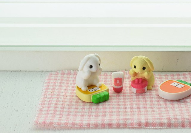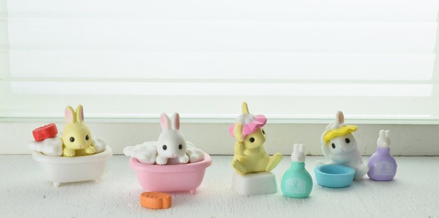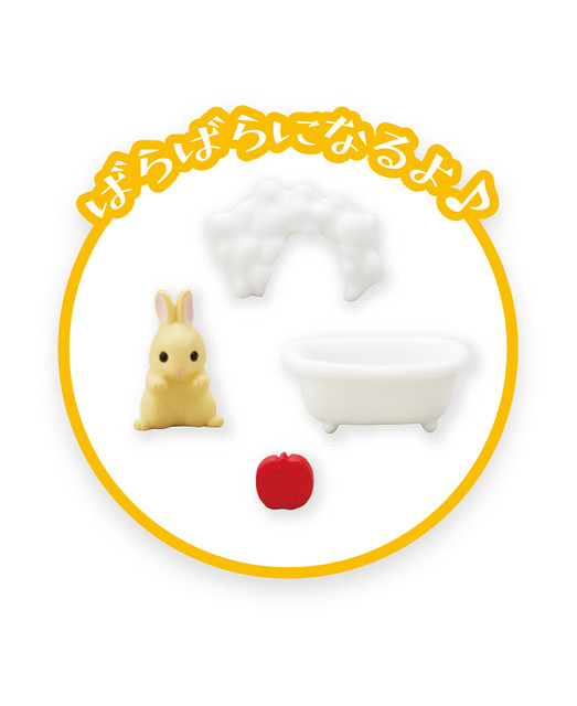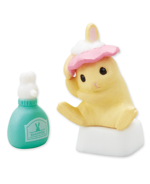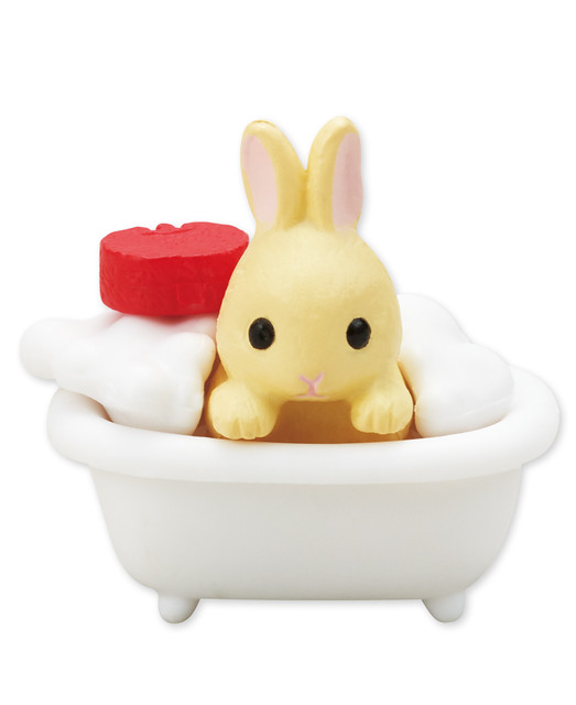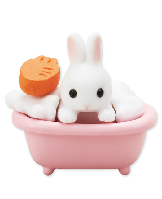 這次將以小兔們的沐浴時間為題材來設計,有浴缸、沐浴帽、洗澡胡蘿蔔造型的海綿、沐浴乳、臉盆、體重計等等浴室相關的小配件都收錄在此次十分撫癒人心的兔兔作品當中,小配件也都是與兔子可以分件的設計,喜愛兔子轉蛋系列作品的玩具人千萬別錯過了啊!