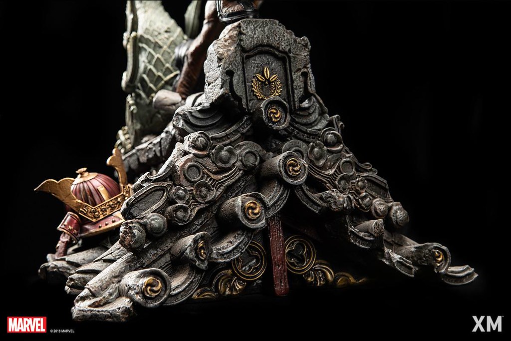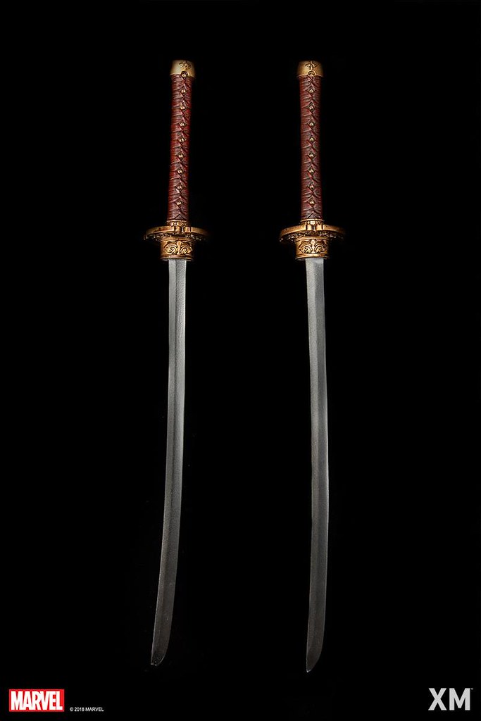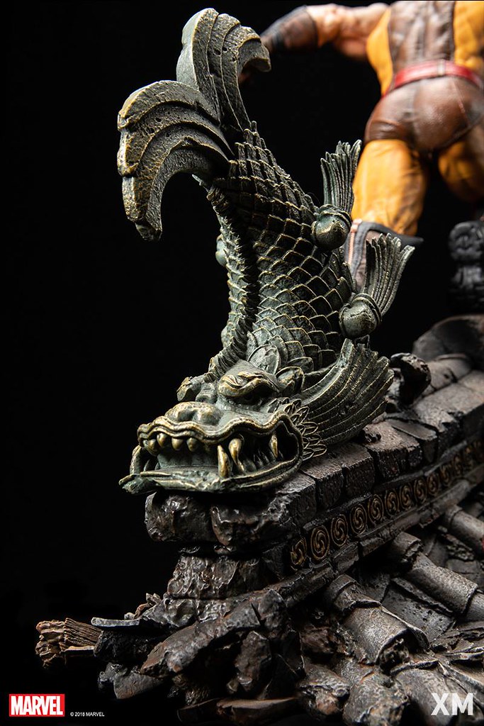 「金鋼狼 褐色戰衣版 1/4 比例全身雕像」高約53 公分,帶著憤怒的狂吼表情,雙手伸出鋼爪,給人相當強烈的威壓魄力!精湛的雕刻工藝與手工上色,將爆起青筋的肌肉、戰衣的皺褶細節、手套、腰帶、帶有厚重感的金屬鋼爪......等逼真地展現,配件部分附屬了咬牙的裸顏頭雕,還有雙臂往前露出骨爪、持握日本刀的替換手型,以日式建築屋頂為題製作的地台擁有寫實的石塊質地,細膩的漸層塗裝與舊化更是大大提升收藏價值啊!
