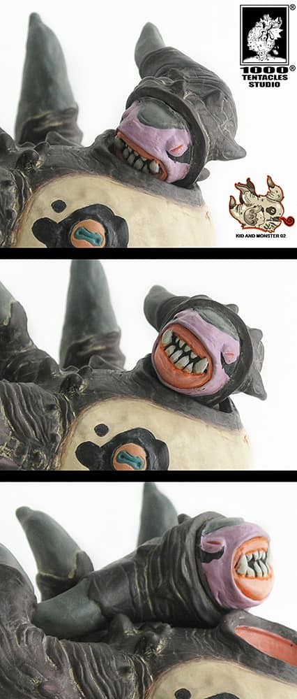 多角獸高約20 公分,頭上的犄角魄力十足且富含層次,有著小小的雙手與粗壯的尾巴,細膩的雕刻工藝與上色不但營造出怪獸的逼真生物感,也給人滿滿的手作質地,本作可以將頭部拆開,把約6 公分高的小孩放進多角獸的身體裡,除此之外,在多角獸額頭上方的角裡頭,還住著一隻面目猙獰的「寄生小賤蟲(Parasite Worm)」啊~實在是超有趣的設計,有興趣的玩具人可以隨時注意1000Tentacles Studio Facebook 粉絲專頁的消息喔。