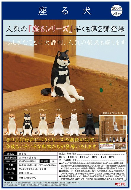 2019年5月22日新增官方宣傳圖以及販售相關資訊,這次一樣將萌寵狗狗以擬人坐著休息的姿態完整呈現出來,延續第一彈"坐著的貓咪",此次還是以特別聰明的「柴犬(シバ) 」來製作,預計將推出約有六種類不同花色的小狗可以收集,轉到重覆花色的狗狗當然也沒有關係歐!擺著一排"坐著的狗兒"的=模樣真是相當療癒,身為柴犬 控的玩具人千萬別錯過了啊!
