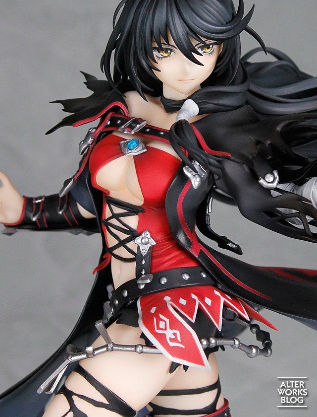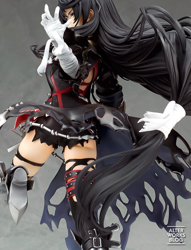 「薇爾貝特·克拉弗 1/8比例模型」以戰鬥狀態般極具躍動感的姿勢立體化,充滿仇恨的表情流露出濃濃殺意,相當帥氣。揚起的黑色長髮具備纖細的髮束造型,蓬鬆的質感是一大看點。服裝部份則在大衣、短褲、長襪等處再現了破損、鏤空的造型,手甲、腿甲、身上多處的金屬裝飾都施以亮銀色塗裝,質感極佳。纏著繃帶的左手則能以零件替換成巨大的業魔手,那銳利的造型、充滿災禍的漸層色彩帶來滿滿的魄力呀!