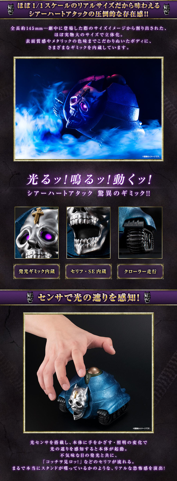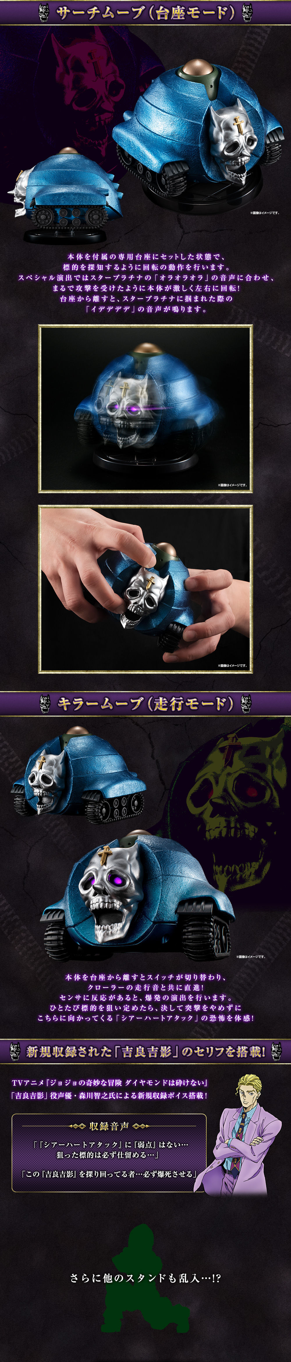 「PROPLICA 穿心攻擊」全長約 145mm,幾乎以實物大尺寸再現劇中造型,打造出特徵的骷髏頭粗糙的表面質感,並施以金屬色呈現厚重質感,更內藏 LED 發光機構、台詞.效果音發聲機構、履帶行走機構,用手遮住頂部的光感測器就能自動啟動,配合眼部怪異發光說出「給我看過來~!」台詞!此外還收錄了吉良吉影聲優:森川智之先生演出的新規台詞,甚至會有其他替身亂入!