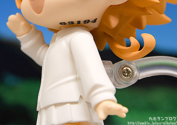 「黏土人 艾瑪」高約10 公分,再現了艾瑪身穿白色孤兒院服裝的身影與翹翹的短髮,不但表現出從黃到橘的細膩漸層,那根呆毛更是相當地搶眼呀!由不同角度看就能發現編號63194 也忠實還原,表情包含微笑開朗臉、認真臉,以及超爆笑的驚慌臉,藉著豐富的替換手型、蹲踞狀態的下半身零件就能演繹出情感豐富的各式動作,配件部分附屬背包、煤燈、可以投出座標和各式訊息的鋼筆,以及暗藏秘密訊息的書,而在「GOODSMILE線上商店」訂購的話還能獲得「米涅瓦先生的藏書票」特製圓形台座特典!