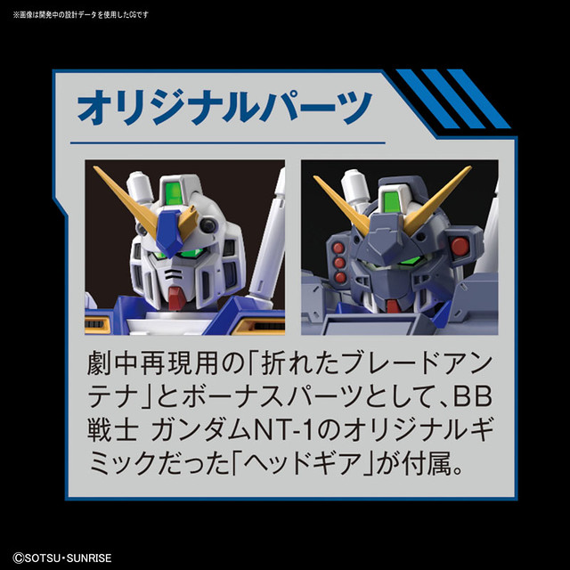 「MG 1/100 鋼彈NT-1 Ver.2.0」的外型更加重現動畫中的設定,肩部的包覆關節構造使用塑膠套再現皺摺質感,除了本體外更一同收錄了特徵的「複合(喬巴姆)裝甲」零件,以 MG 級別的精細度再現骨架、本體裝甲、複合裝甲骨架、複合裝甲多重構造。複合裝甲更有 MG 原創機構,能將多處推進器前的裝甲展開,甚至能將盾牌、手腕的複合裝甲展開露出內藏手部的 90mm 格林砲管!而頭部還能替換戰損的「斷裂天線」以及 BB戰士 鋼彈NT-1 原創的「頭部裝甲」!