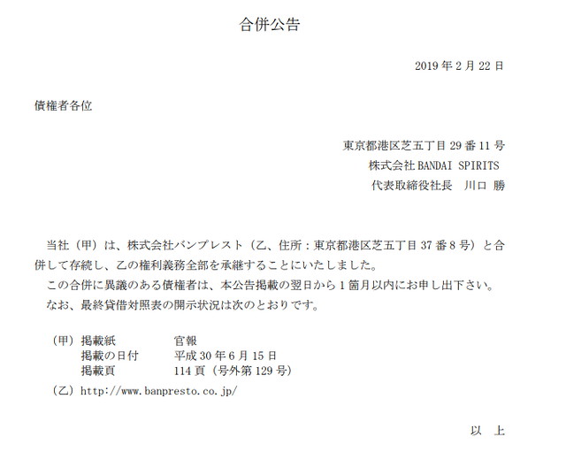 ▼ BANDAI SPIRITS 、BANPRESTO 合併公告。