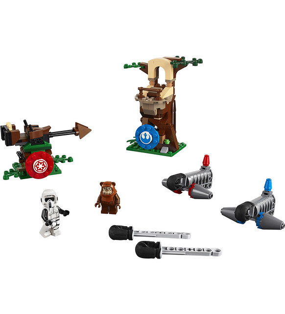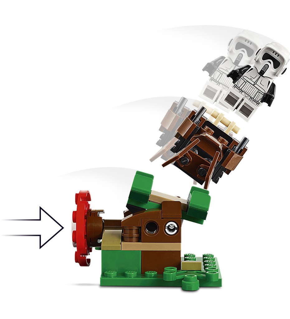 來自《星際大戰六部曲:絕地大反攻》的恩多戰役,稍嫌陽春的森林場景各自搭載了藍色的反抗軍與紅色的帝國軍標誌靶心,並配有簡單的射擊裝置,人偶部分附屬了伊娃族、帝國偵察兵,偵察兵還配有反重力摩托車!根據官圖的資訊,當你用子彈擊中標靶之後,就會藉著連動機構與場景互動,達到讓樂高人偶跌落的效果。