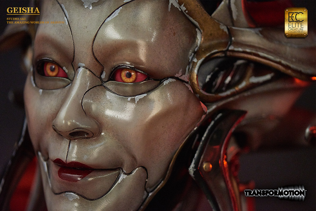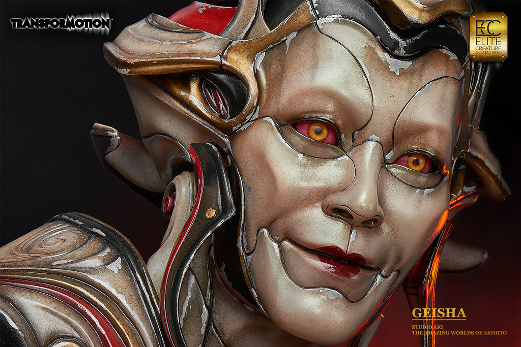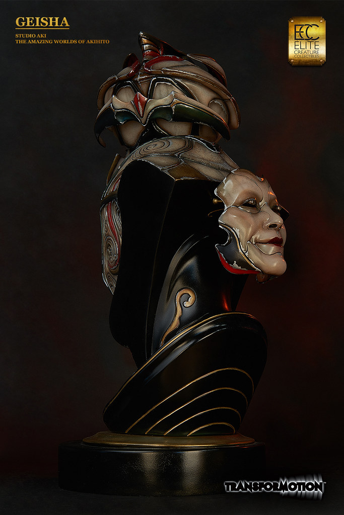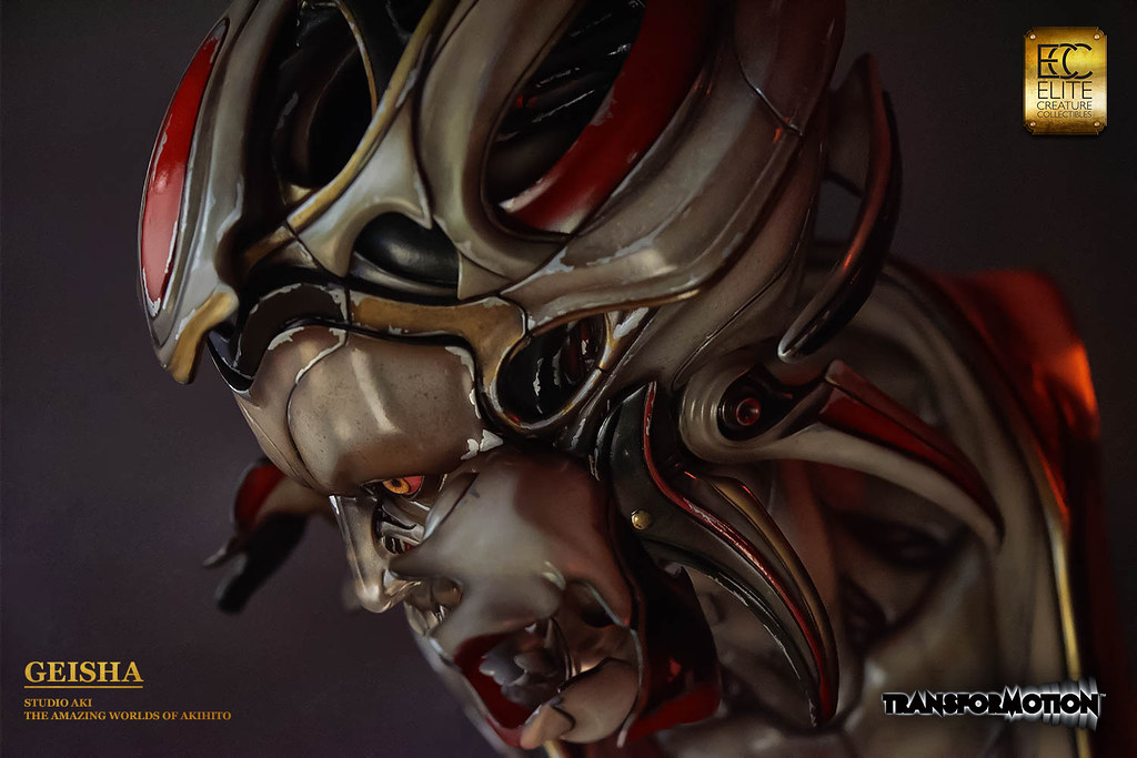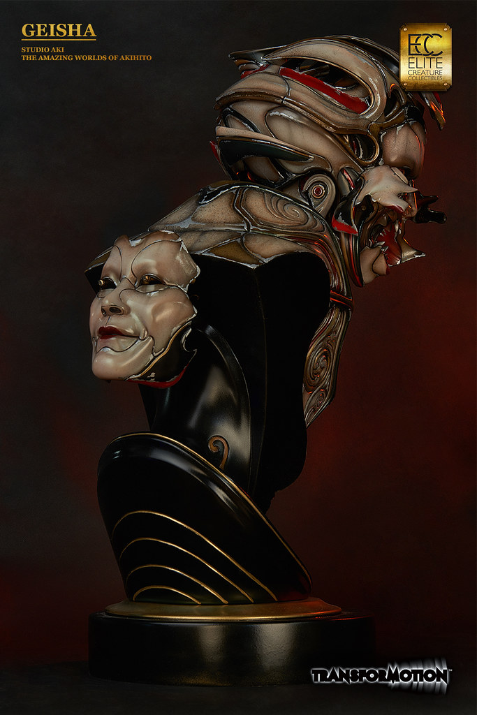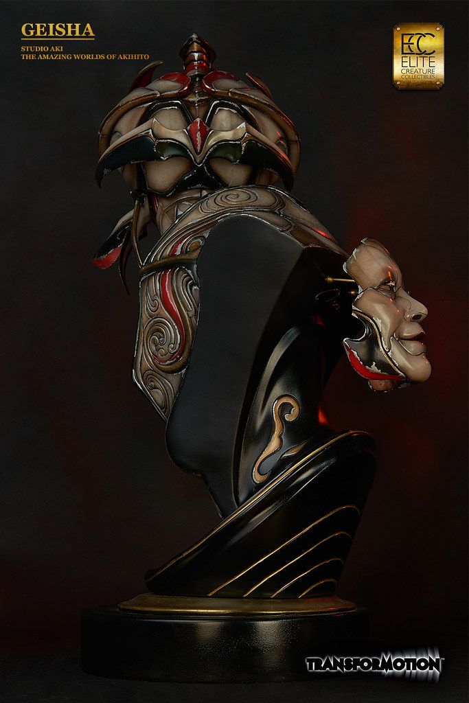 「藝伎 by Akihito 1:1 比例胸像」高約32 公分,Akihito 在傳統的藝妓相貌中注入了極具科技感的機械刺客(Android assassin) 元素,玩家不但可以移除藝伎的面具,享受位於面具下方、擁有強烈存在感的解剖構造,還可以戴上邪惡面具,使其風貌更具侵略性!而底座則是以日式漆器為題設計,使完整性再提升!