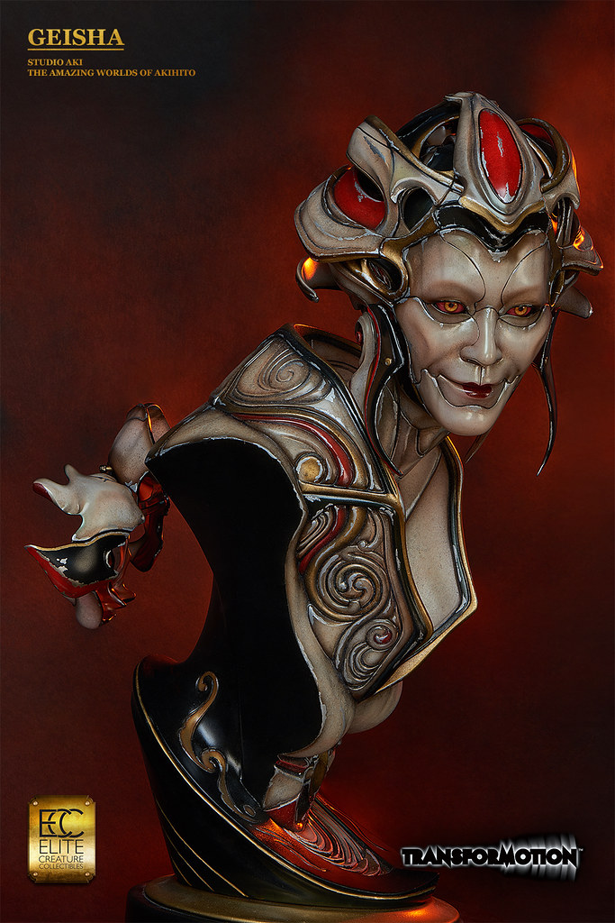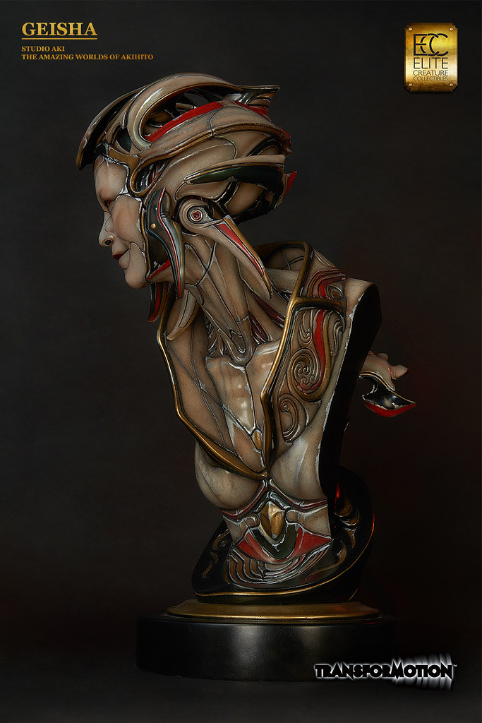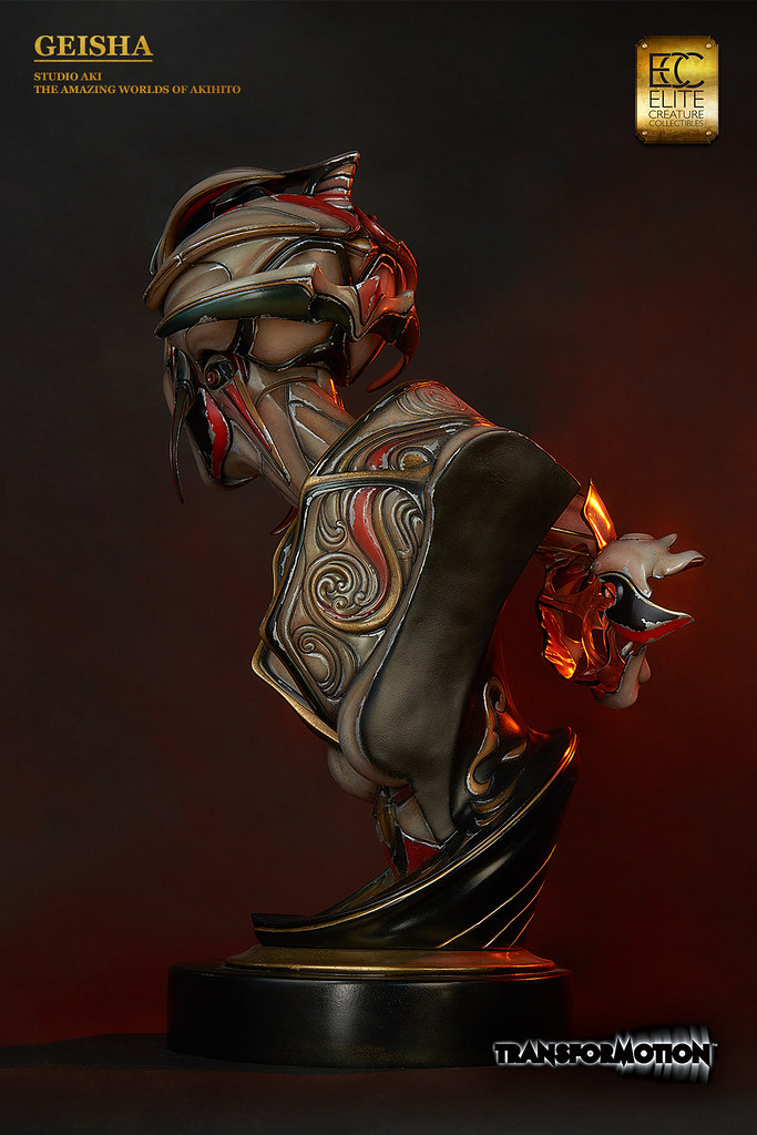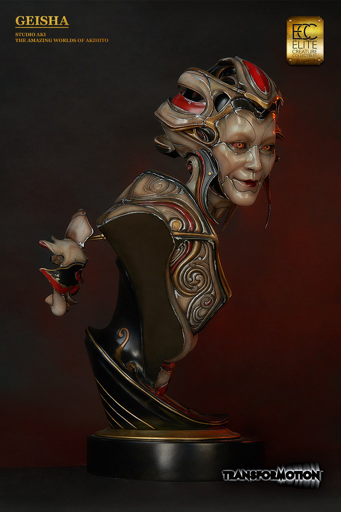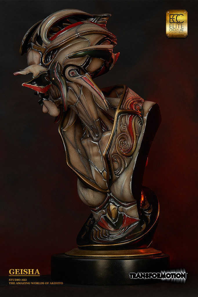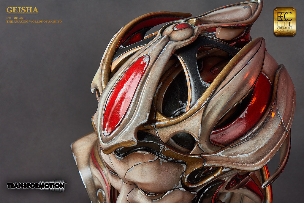 「藝伎 by Akihito 1:1 比例胸像」高約32 公分,Akihito 在傳統的藝妓相貌中注入了極具科技感的機械刺客(Android assassin) 元素,玩家不但可以移除藝伎的面具,享受位於面具下方、擁有強烈存在感的解剖構造,還可以戴上邪惡面具,使其風貌更具侵略性!而底座則是以日式漆器為題設計,使完整性再提升!