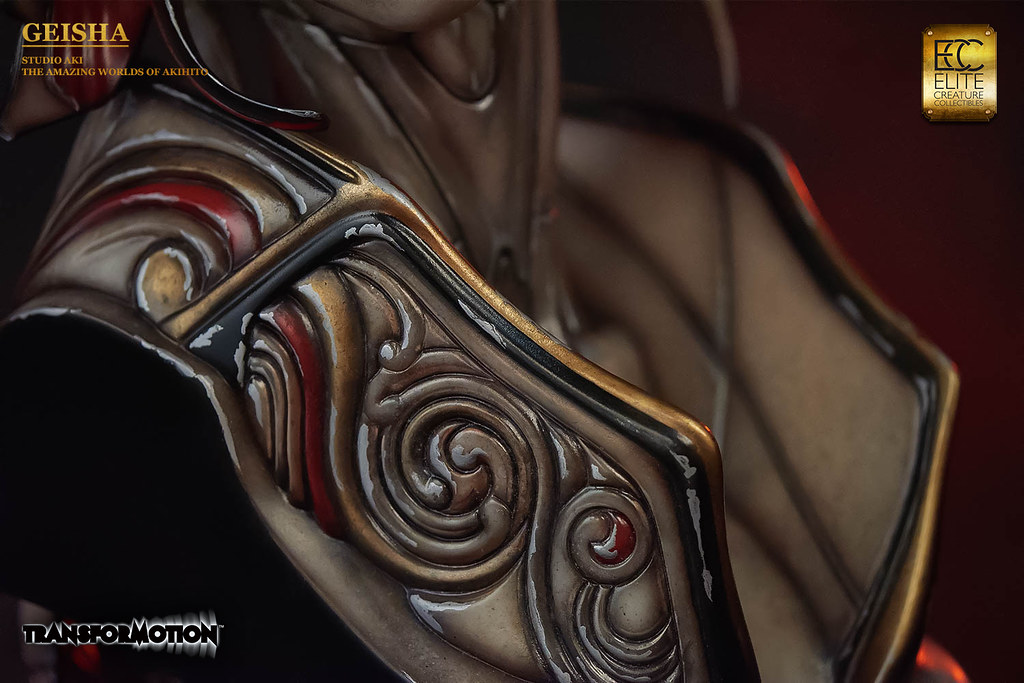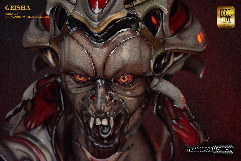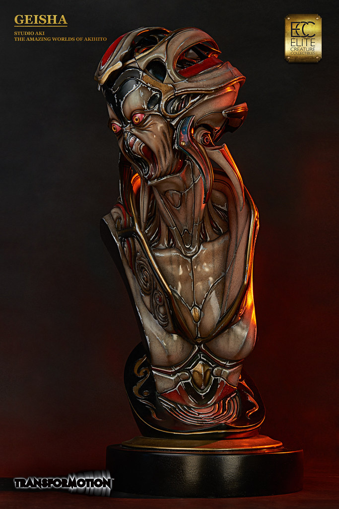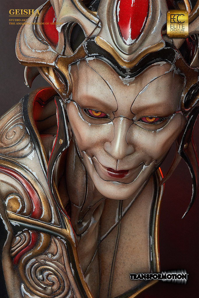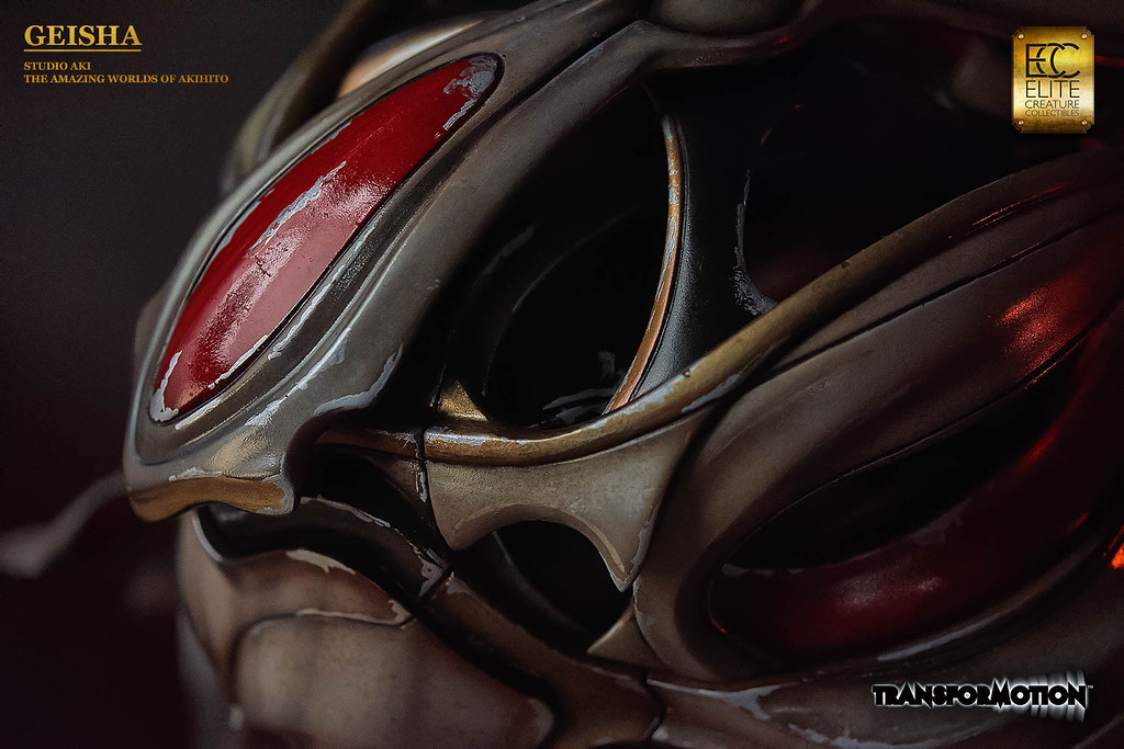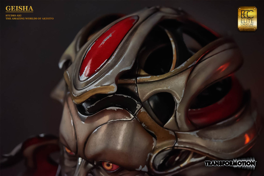 「藝伎 by Akihito 1:1 比例胸像」高約32 公分,Akihito 在傳統的藝妓相貌中注入了極具科技感的機械刺客(Android assassin) 元素,玩家不但可以移除藝伎的面具,享受位於面具下方、擁有強烈存在感的解剖構造,還可以戴上邪惡面具,使其風貌更具侵略性!而底座則是以日式漆器為題設計,使完整性再提升!