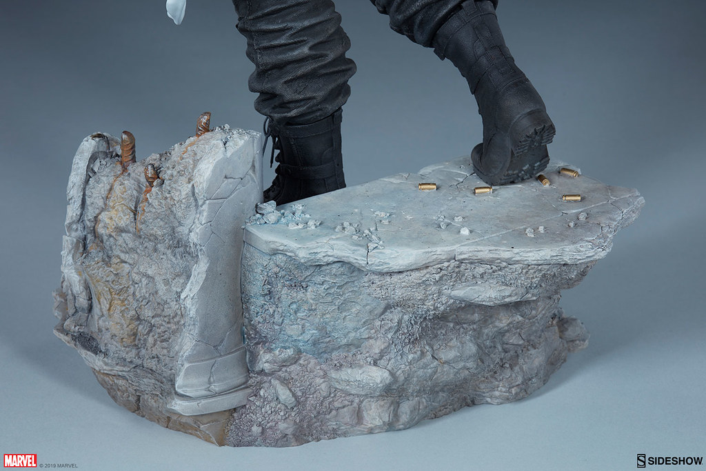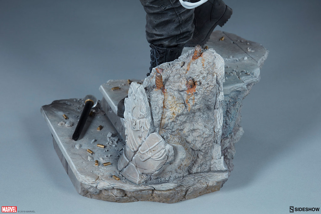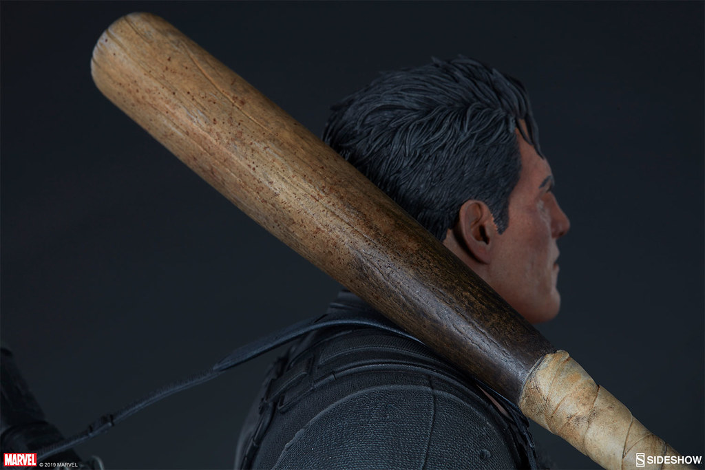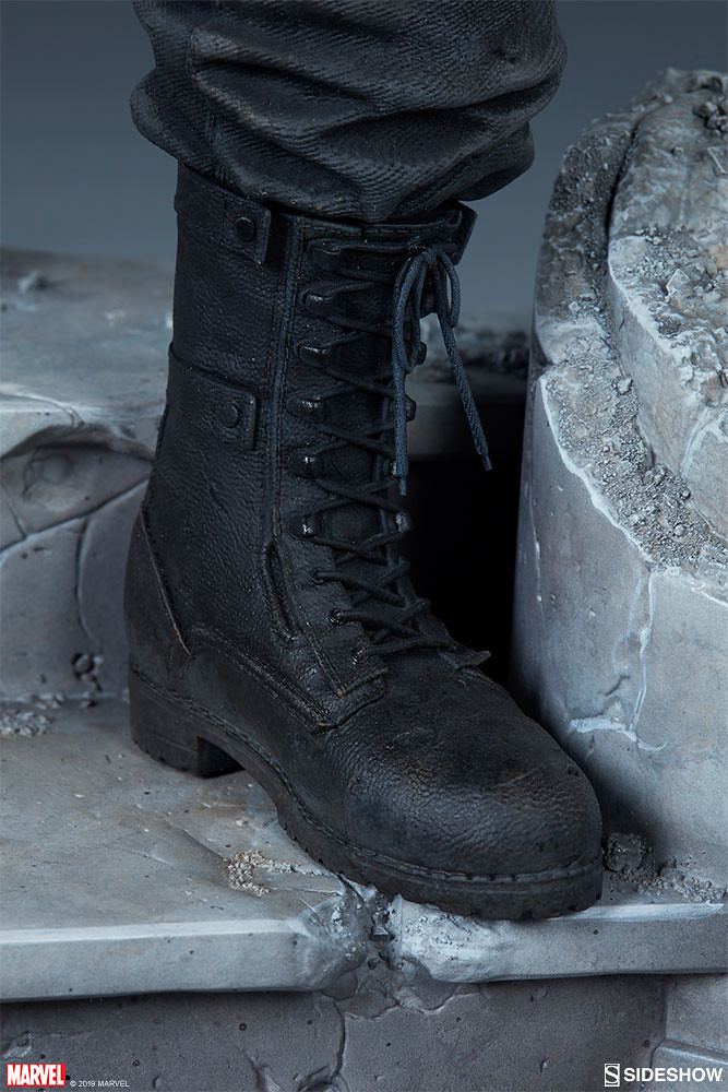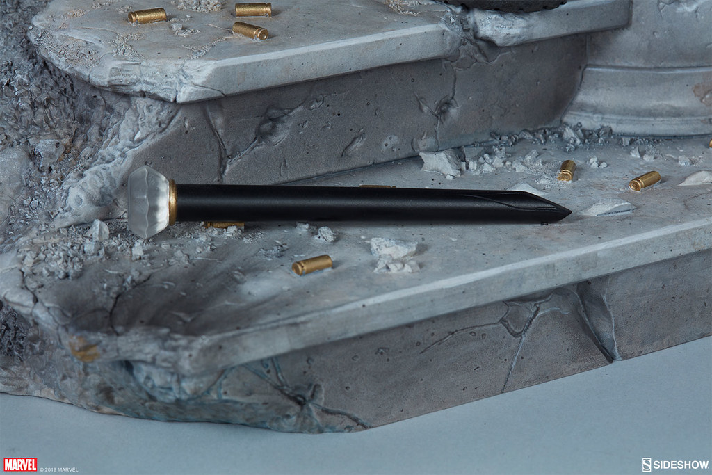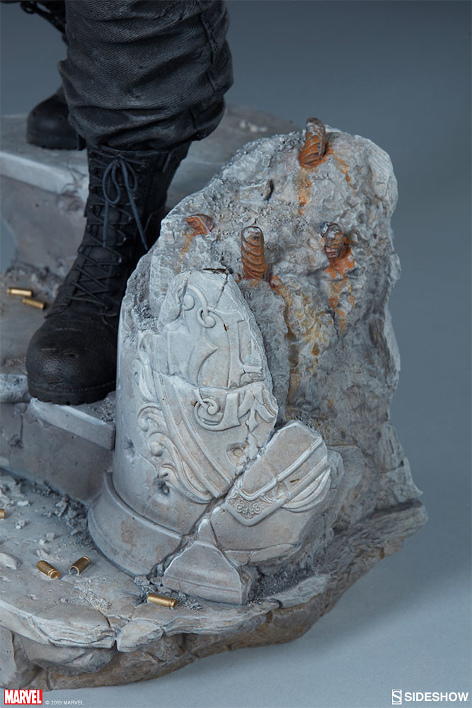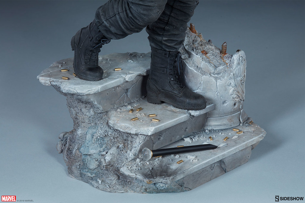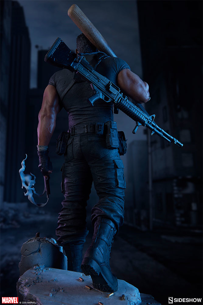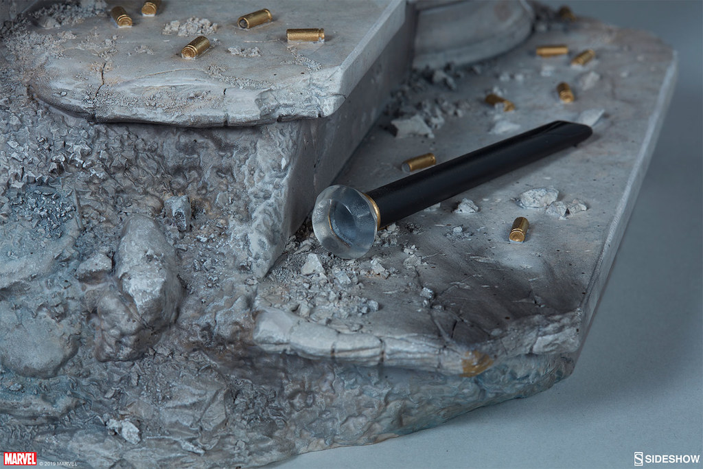 「制裁者 1/4 比例全身雕像」高約58.8 公分,有著壯碩魁武的身軀,結實的肌肉與一身配掛的戰術配備給人極具魄力的視覺效果!右手握著球棒靠在肩上、左手則呈現持槍的狀態,有趣的是從槍口冒出來的硝煙竟然有著白色骷髏的造型!印製了白色骷髏的短袖T-Shirt、黑色工作褲、長靴都做出了寫實的舊化破損處理,球棒、手背上的血跡、臉上的傷痕更是十分逼真!以階梯為題製作的地台不但有著散落一地的彈殼,還能看到金霸王(Kingpin)鑲有鑽石的手杖斷了一截掉在地上,為本作更添故事性。