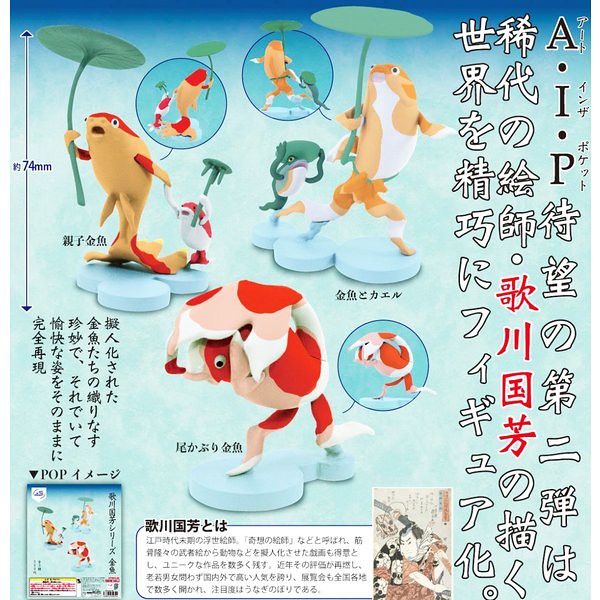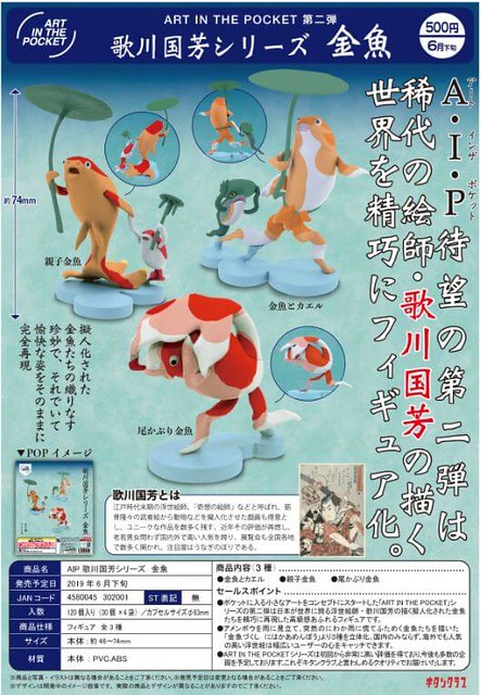 2019年6月19日新增官方宣傳照片以及販售相關資訊,專門推出趣味題材轉蛋商品的奇譚俱樂部(株式会社奇譚クラブ)"玩具公司,這次將以日本江戶時代末期知名浮世繪師「歌川國芳」的"金魚"為題材來推出,新系列『ART IN POCKETシリーズ』(簡稱為AIP)第一彈推出過「Mio Hashimoto 猫的彫刻」相當受到喜愛貓咪粉絲們的歡迎,這次將經典的浮世繪「金魚」擬人畫作以轉蛋尺寸再現,喜愛《歌川國芳》筆趣系列的玩具人可以參考一下歐!