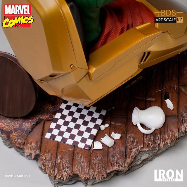 X教授呈現出正在使用心靈感知能力的招牌姿態,左手伸出中指、食指並指向腦袋,伸直的右臂手掌則展現出抓握狀態,聚精會神的表情、眉間與臉部的皺紋都細膩地形塑,綠色西裝高度再現其寫實皺褶與布料紋路,金黃色懸浮椅也考究地還原了造型與各處機構細節,本作還可讓教授加裝腦波增幅頭盔喔!地台與前作「魔形女」的主題相同,皆是以殘破的室內場景設計,損壞的木質地板施以精湛的塗裝、刮痕處理,一旁還散落著西洋棋、破掉的茶壺、斷裂的桌子,使整體擁有著更加豐富的故事性!根據官方表示,之後還會有更多X戰警的新作,實在令人期待呀!