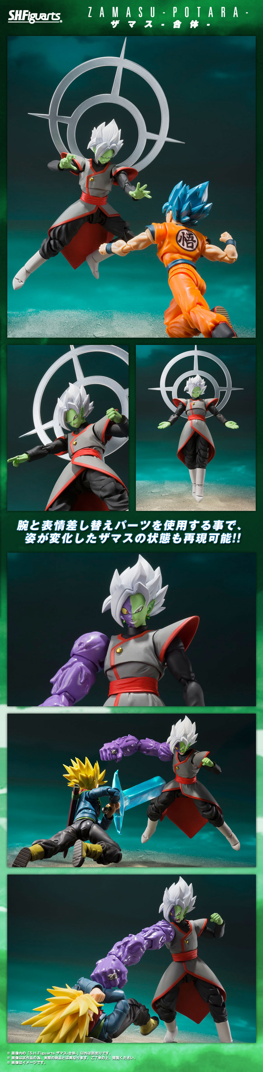 在《七龍珠超》電視劇情的「超賽亞人特南克斯(未來)超サイヤ人 トランクス(未來)」篇章中"黑悟空"與"扎馬斯"使用波特拉耳環所「合體」的『扎馬斯-合體-』樣貌,這次將商品化來推出,此作附有交換用左手首2種、交換用右手首3種、交換用巨大化右腕、交換用首配件以及交換用表情配件3種等等豐富配件,將於Premium Bandai 線上商店在2019年3月8日開始接受訂購,對《七龍珠》動畫系列作品有興趣的玩具人千萬別錯過了。