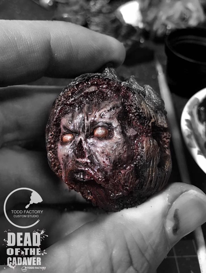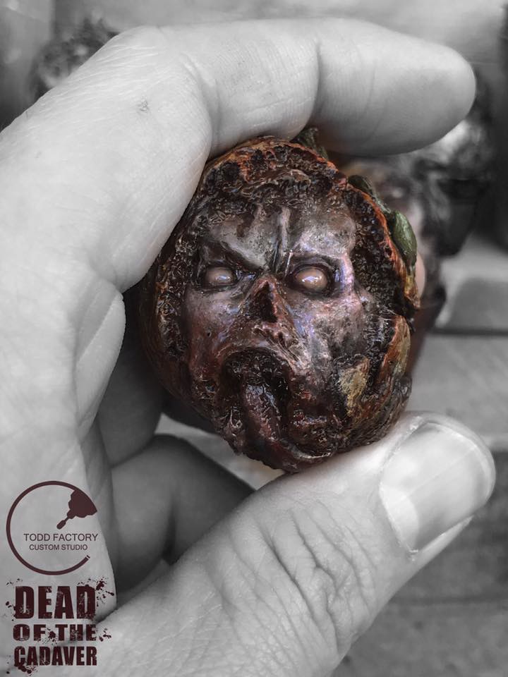 接續「殘酷蒐藏系列伍 燭光碗餐」,這次的「殘酷蒐藏系列六 腥頭殼」同樣是以人頭為題材打造,一整顆彷彿泡水泡了一段時間、腐爛得"剛剛好"的頭顱,有著一條垂下來的舌頭,有趣的是這次的腥頭殼還是被塞入腐敗蔬果中的狀態,還是說,這其實是一個會長出人類頭顱的未知蔬果品種呢?!發白的皮膚、肉體的皺紋,與發黑的果肉、乾癟的蒂頭,全都以精湛的雕刻、上色來完成,尤其那腫脹雙眼的色澤更是相當逼真呀~!