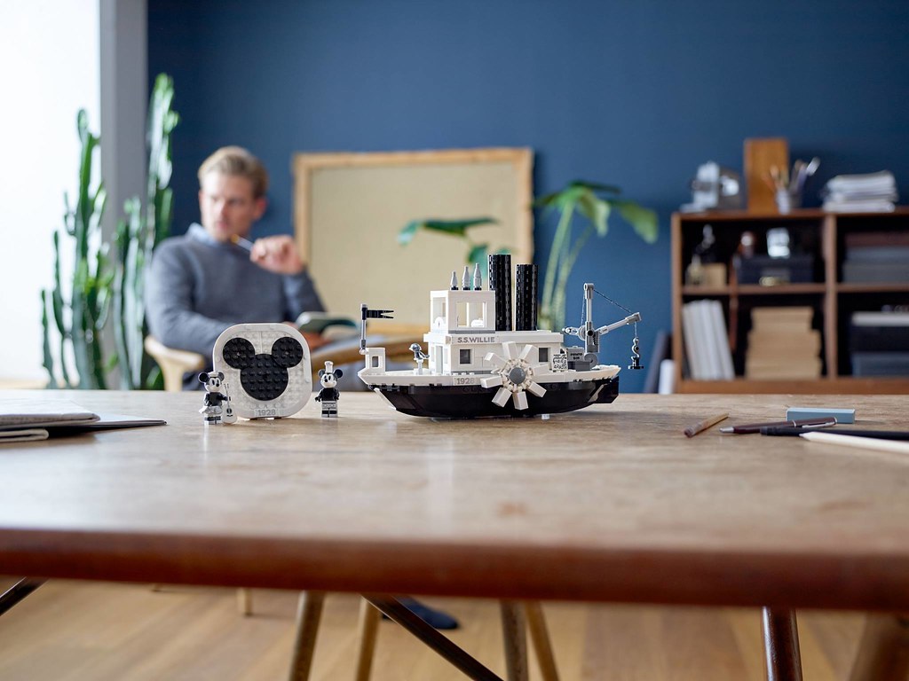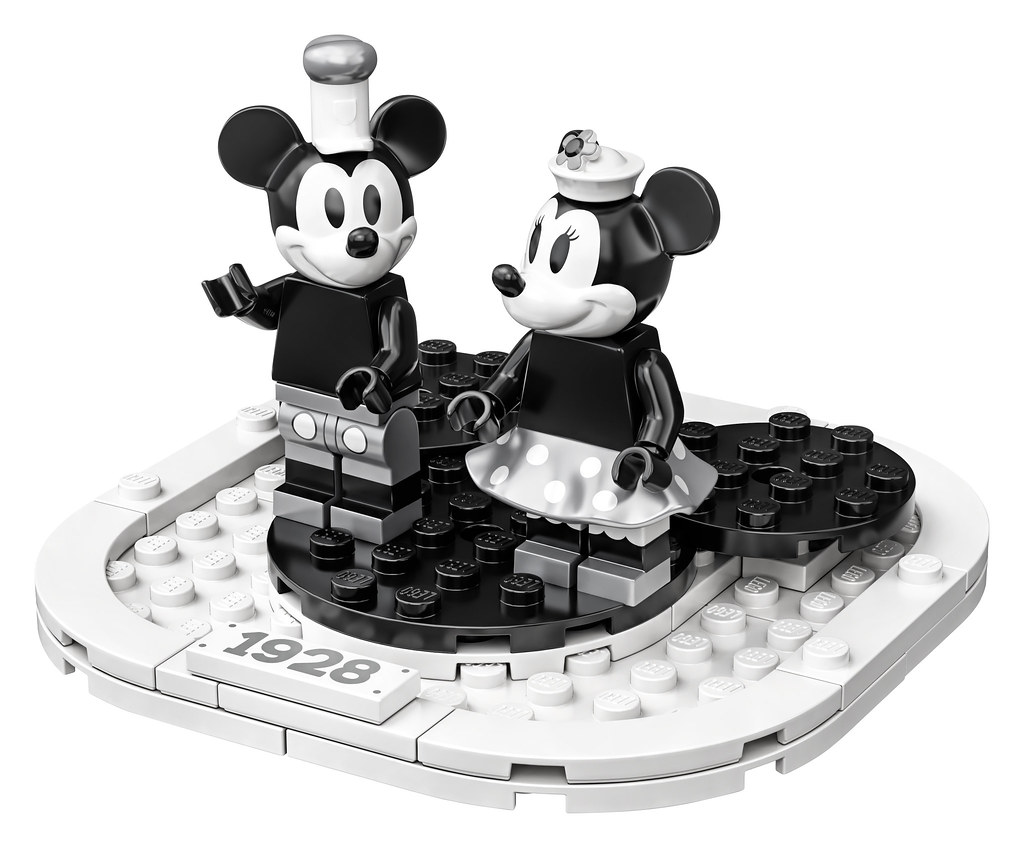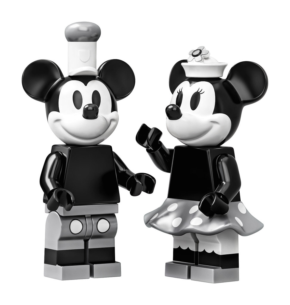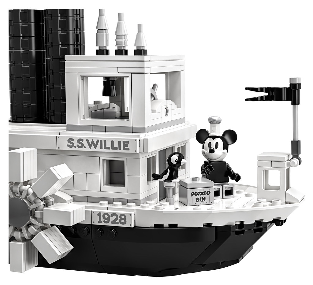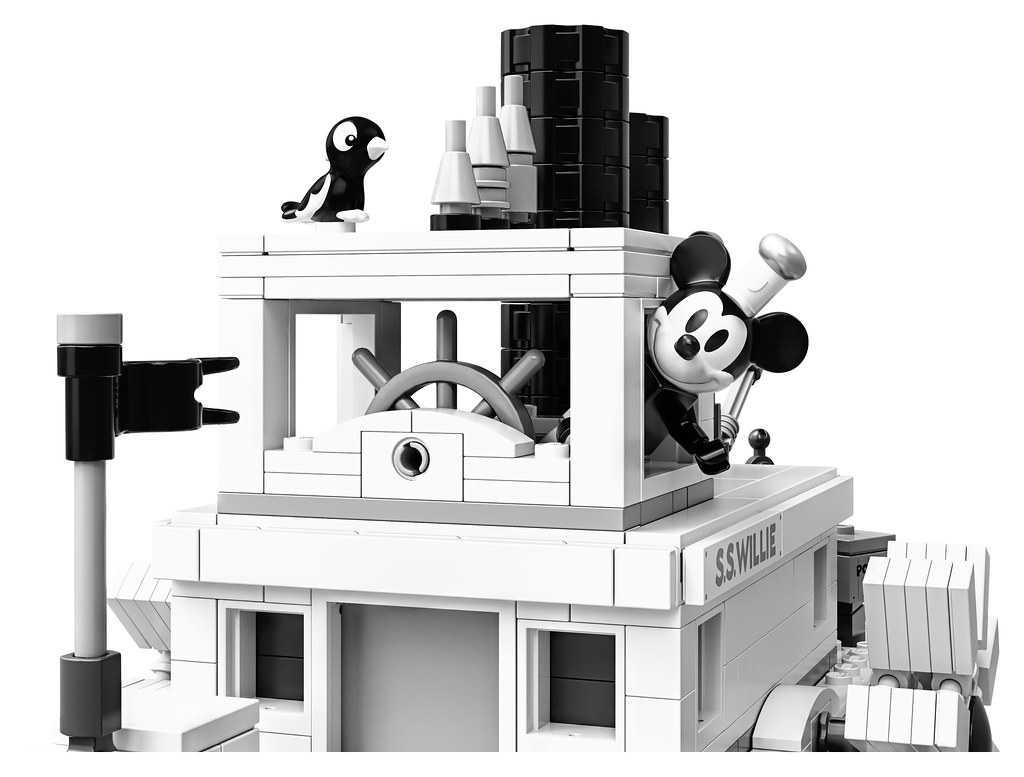 本作用上黑、灰、白三色的磚再現了動畫中的經典汽船,兩側的水輪明顯地加厚,煙囪、汽笛、鉤子的部分也更加精緻,讓人興奮的是官方也將黑白米妮、鸚鵡加入這次的內容中,而且米奇、米妮人偶並不是單純將「LEGO 71012 迪士尼人偶抽抽包」的版本重塗,還有戴上帽子實在太可愛啦!米妮手上的吉他、樂譜、有著「S.S. Willie」與「1928」字樣的印刷磚都讓這款作品更加經典好玩。