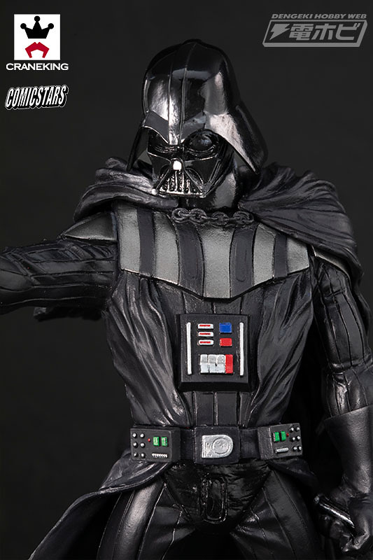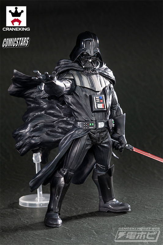 從過去的WCF 系列、豪塊、兼具可動的超豪塊,到具有獨特「和風」感覺的DARTH VADER Gallery,由Banpresto 所製作的達斯·維德景品對星戰粉來說絕對是CP 值超高的收藏吧!本次的「COMICSTARS 達斯·維德」高度維持了約16 公分的大小,左手持握光劍、右手則展現出彷彿正在使用原力的霸氣姿態!除了忠實再現了一身戰衣的造型細節外,本作在極具躍動感的披風、下擺,以及因為動作而產生的皺褶有著深刻的線條刻畫,再加上頭盔、小腿護甲的亮眼光澤,整體視覺效果相當強烈!帥慘~
