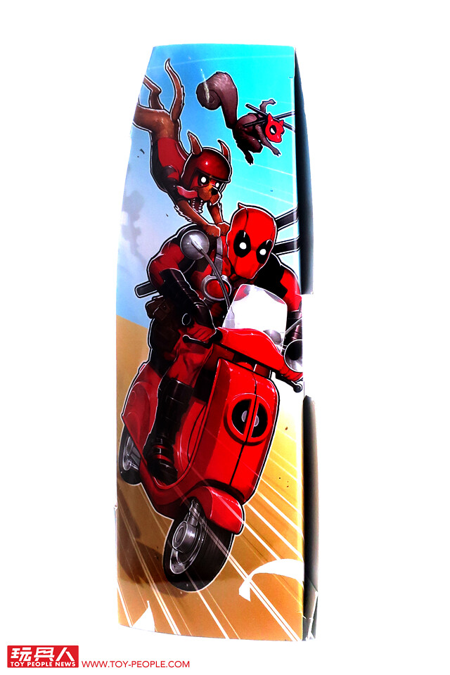 ▼就先來看看大家最喜歡、可愛又迷人的惡棍英雄「死侍」吧!外盒背面可以明顯看到死侍獨特的「突破第四面牆」特質。