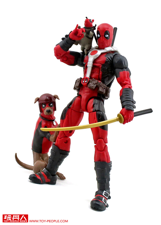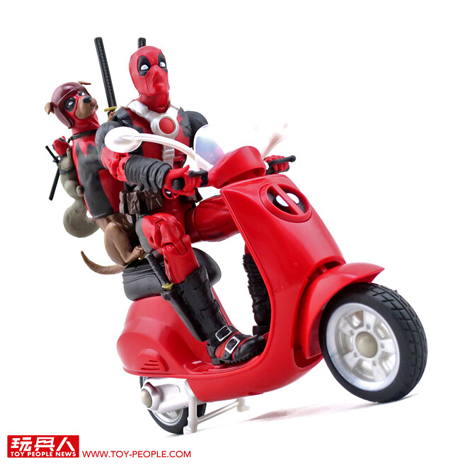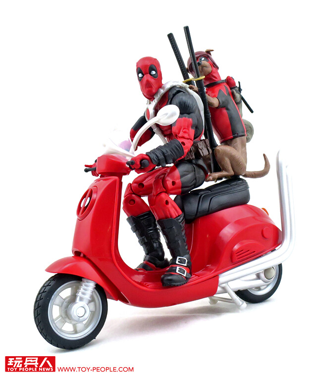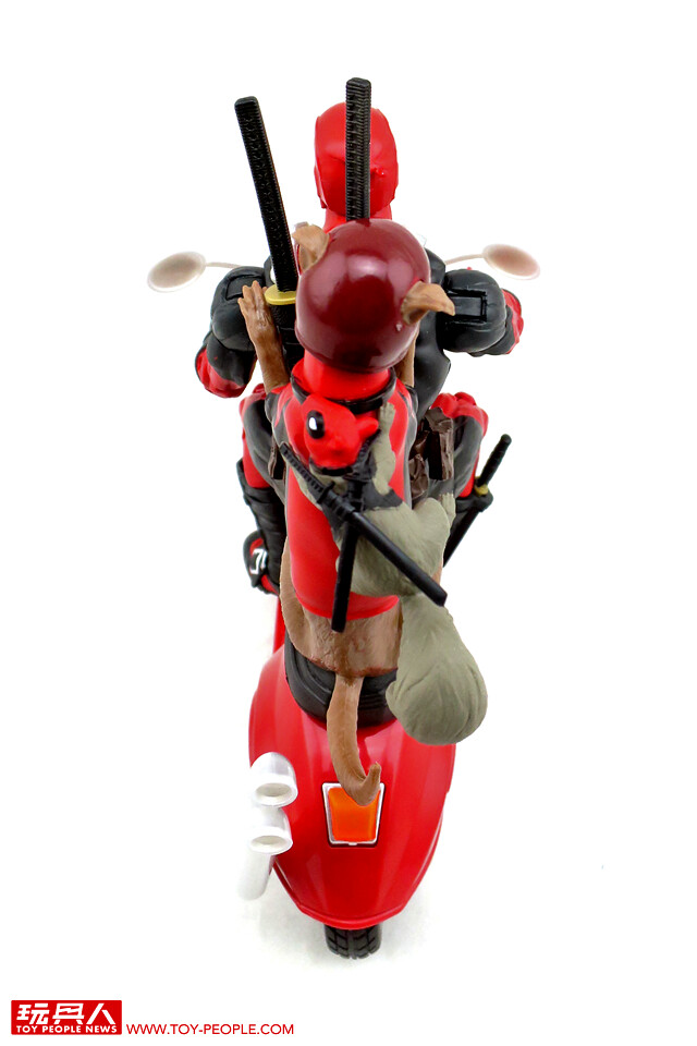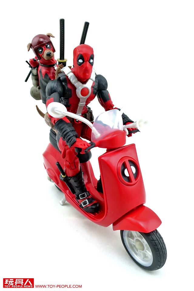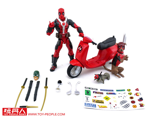 ▼配件一覽,包括死侍人偶本體、金色的雙刀與刀鞘、藍波刀、鮑伯(Bob)頭雕、紅色摩托車、後照鏡、手捏喇叭、松鼠侍(Squirrelpool)、狗侍(Dogpool),以及裝飾機車的專用貼紙。