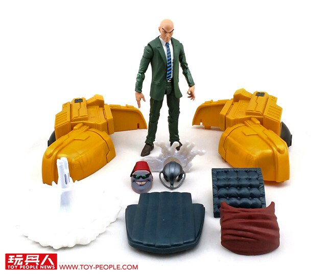 ▼教授與配件一覽,包括了拆為兩塊以方便包裝的懸浮椅(Hover Chair)、內裝的靠背與坐墊、毯子,飄浮特效零件兼支架、腦波增幅器(Cerebro)的頭盔與特效零件,以及一顆影王(Shadow King)的頭雕。