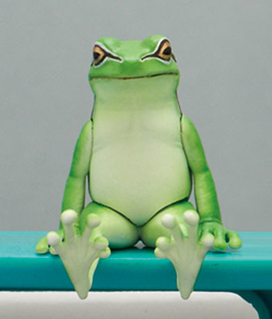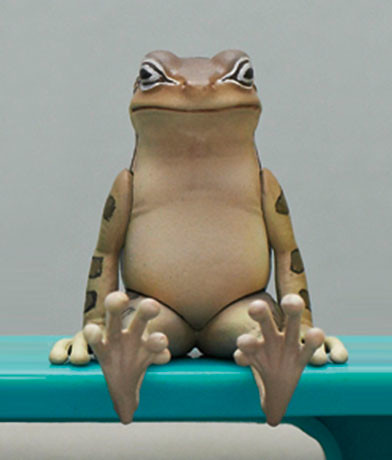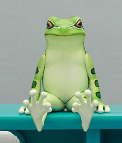 平常總是四角著地爬行、跳躍的青蛙這次也加入擬人化的坐姿行列囉~伸出兩條長腿、雙手還撐著地板的樣子實在是奇特又療癒!與前兩彈貓咪、狗狗毛茸茸的身體表現不同,再現了青蛙光滑的膚質,苗條的軀體線條逼真形塑,除了各處的漸層塗裝外,背部的花紋也有著不錯的描繪!喜歡青蛙轉蛋的玩具人很值得轉個幾隻來收藏呀~值得一提的是上圖最右邊的「アルビノ」是體內缺乏黑色素所導致的白化,就連那橘色的雙眼也忠實還原了。