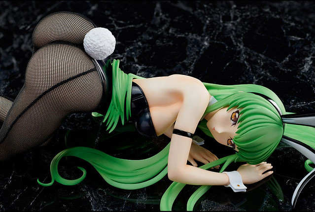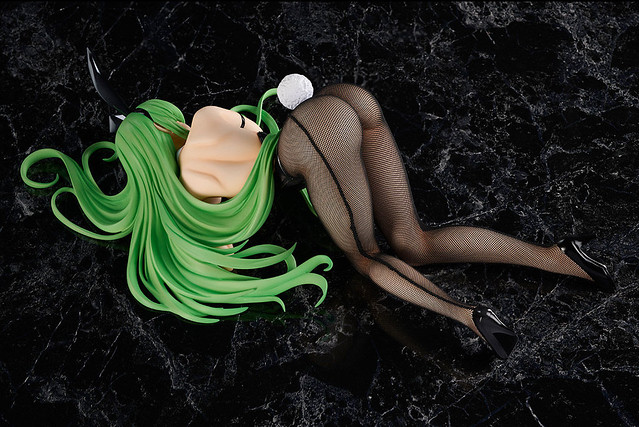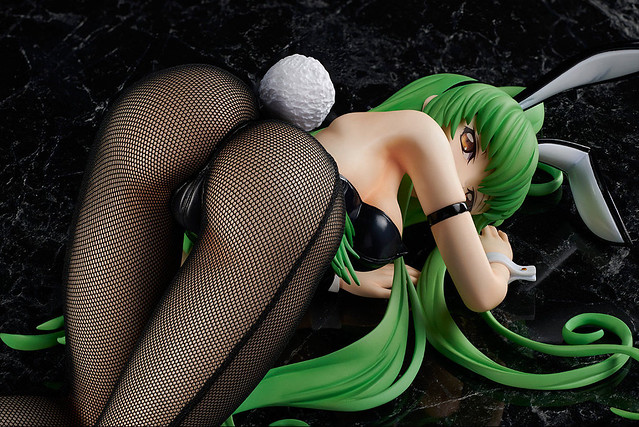 「C.C. 兔女郎Ver.」由擔任角色設計的木村貴宏先生進行監修,以 1/4 比例、全長約 40 公分大尺寸展現魔女的兔女郎之姿,散於地面的髮束、曲線誘人的美背皆有精緻細節,很明顯地這款 C.C. 主打的就是高高翹起的臀部,渾圓豐滿的形狀極度撩人,搭配真實布料縫製而成的網襪更為性感!